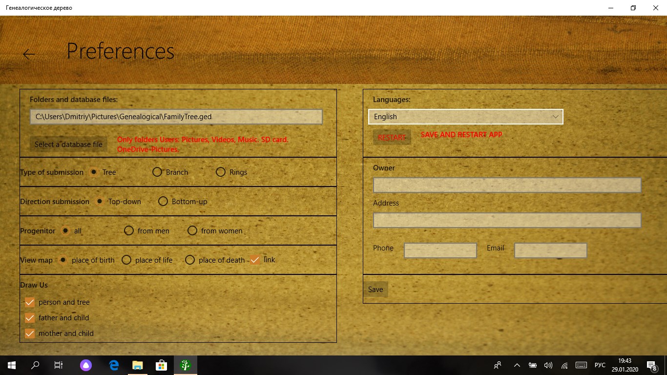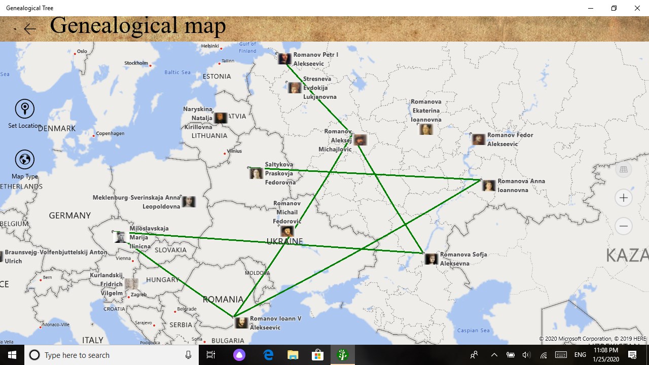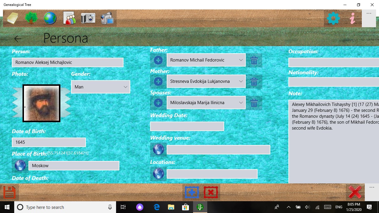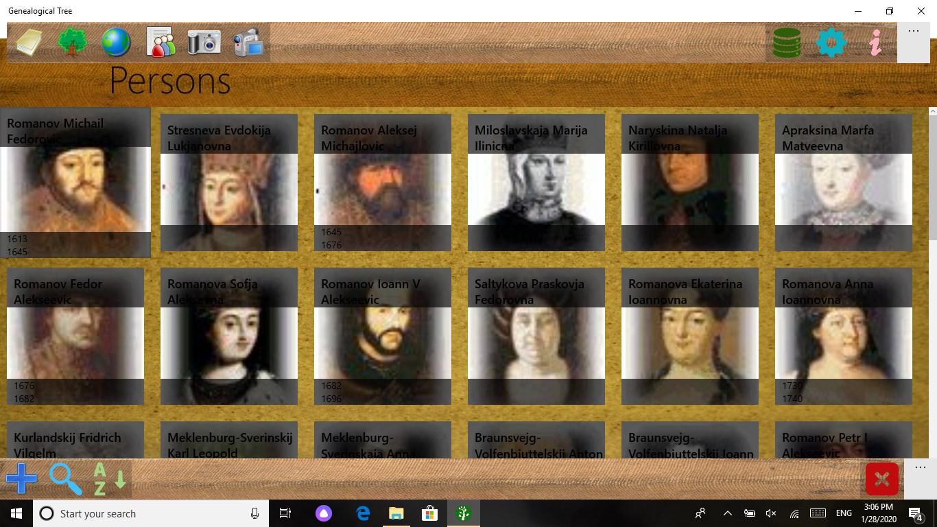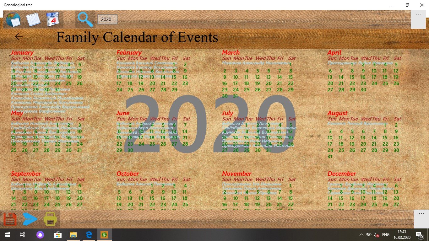 The application was created to store the historical heritage of the family. Keeps a list of people and their family ties, photographs, copies of documents and videos. Draws trees on a graphics and hypertext canvas. Saves photos and videos. Shows a calendar of family events, which makes it possible to visually see the days of important family events.