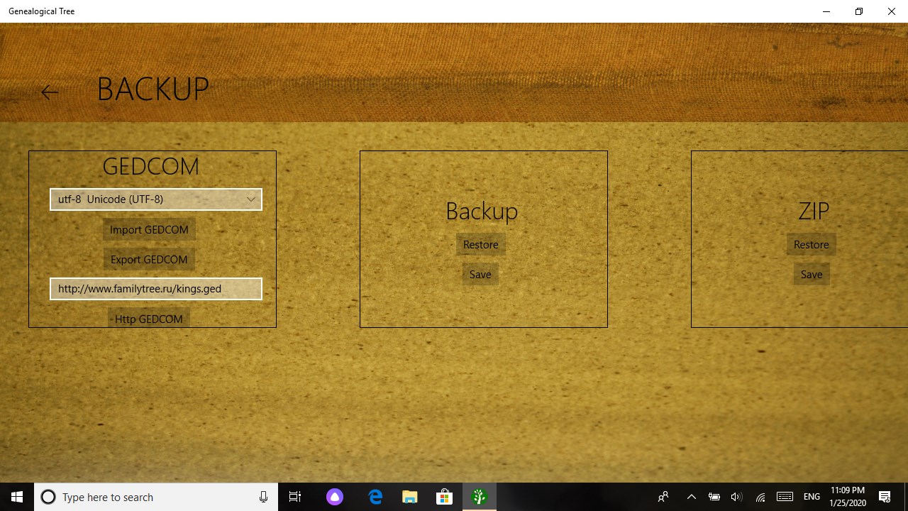 The international format for storing genealogical information GEDCOM is used as a database.