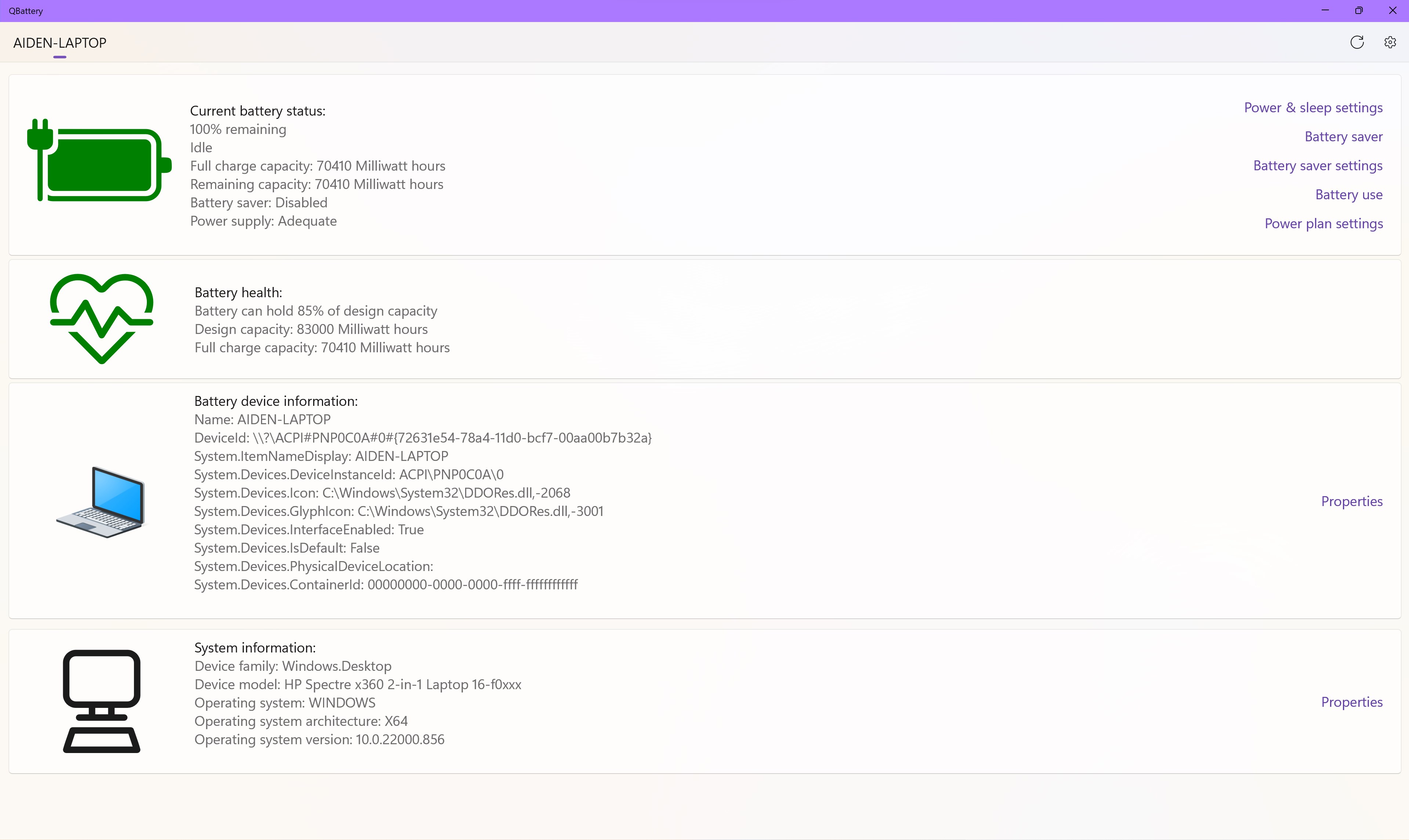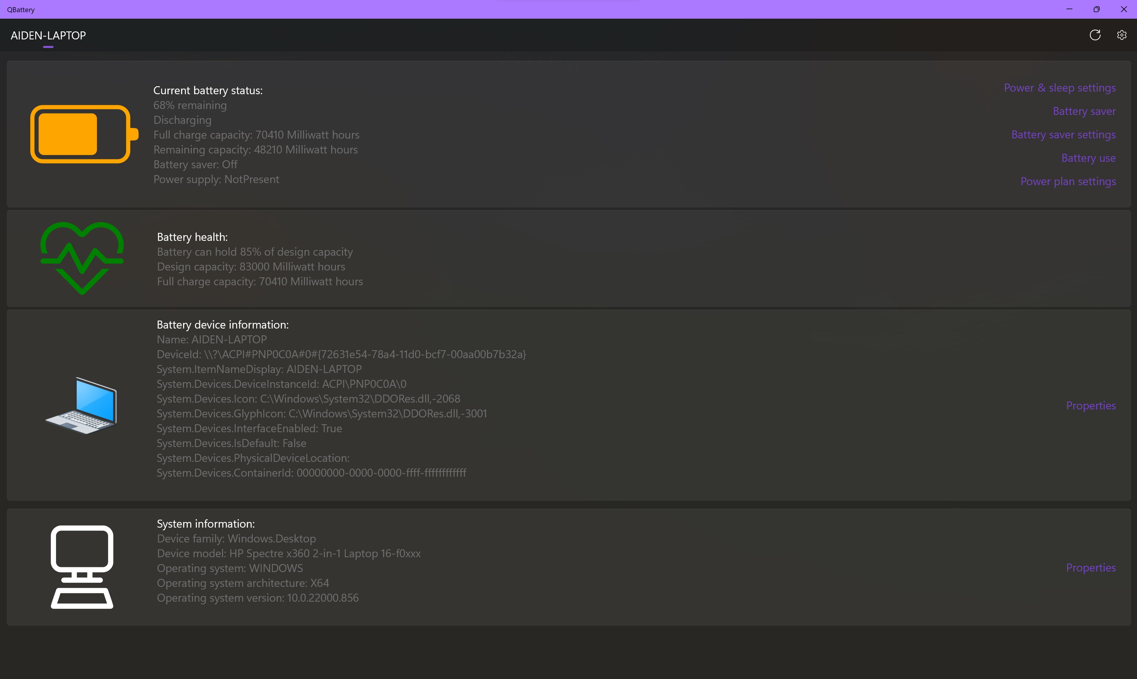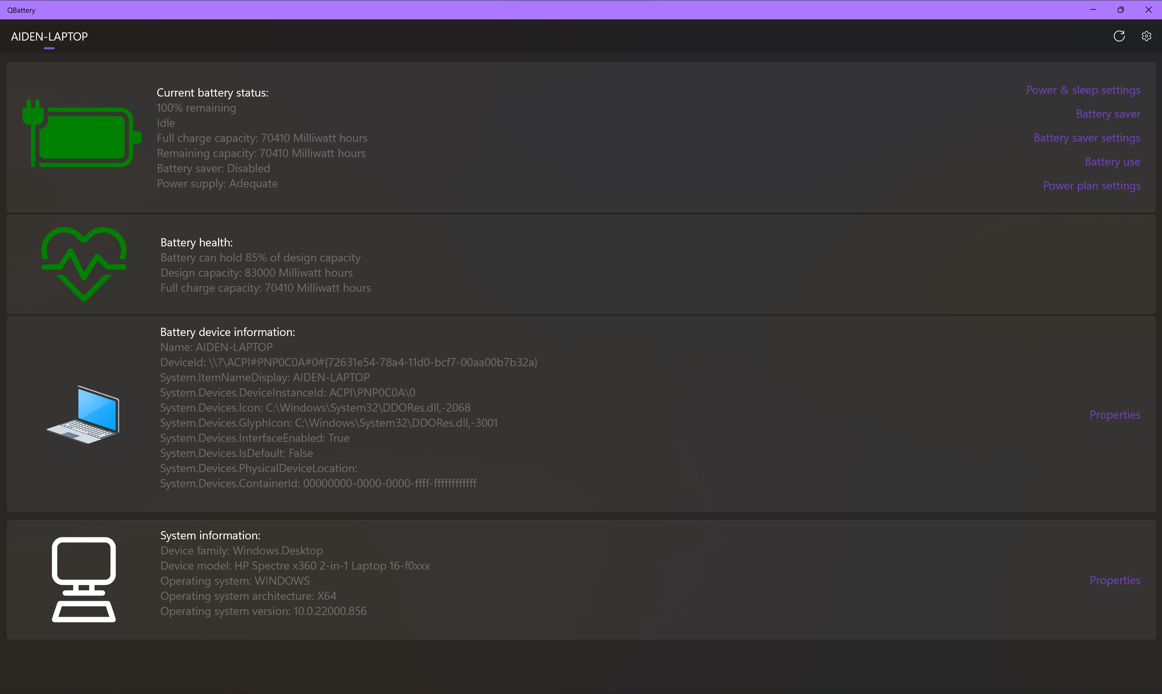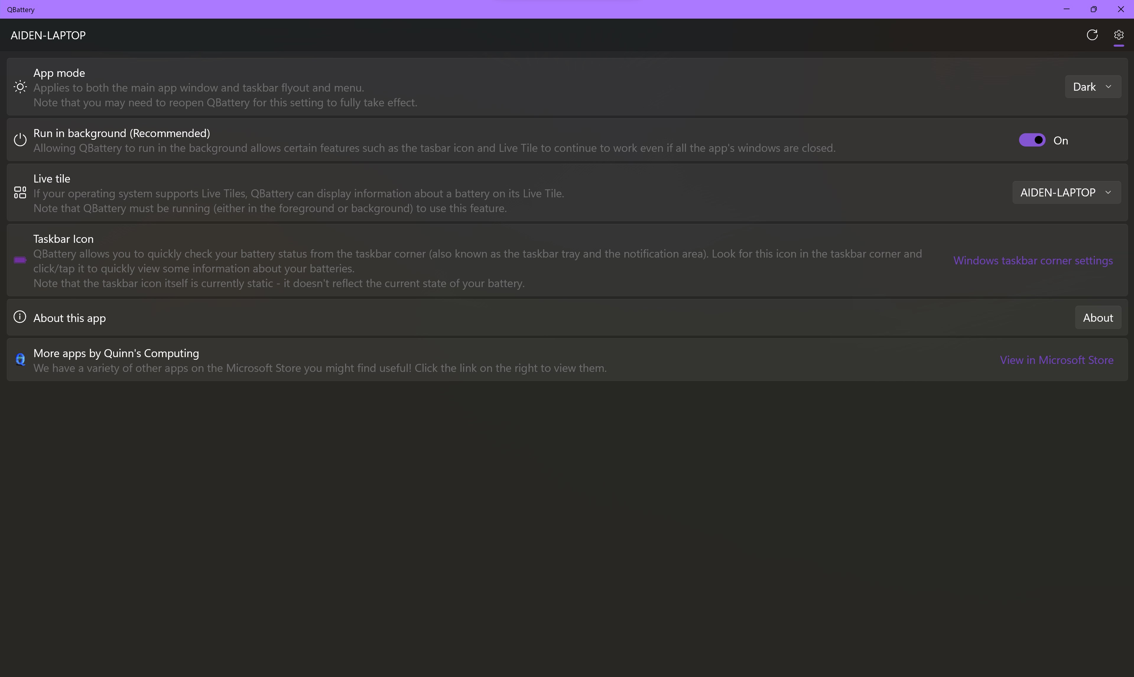 QBattery allows you to easily monitor the status and health of your device's battery (Or batteries if you have multiple). QBattery also displays an icon in the taskbar corner which you can click/tap to quickly view important status and health information about your batteries at a glance and even allows you to display battery information on its Live Tile.