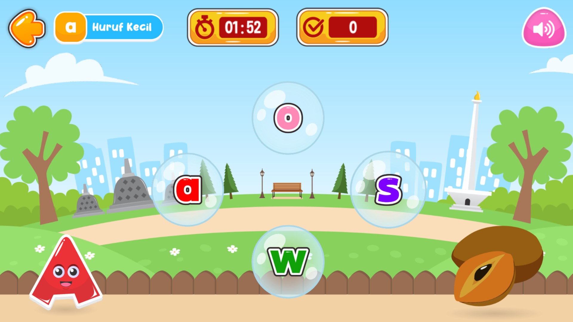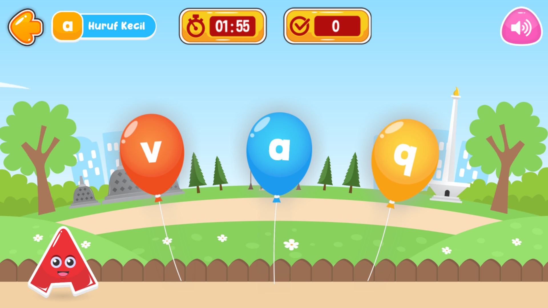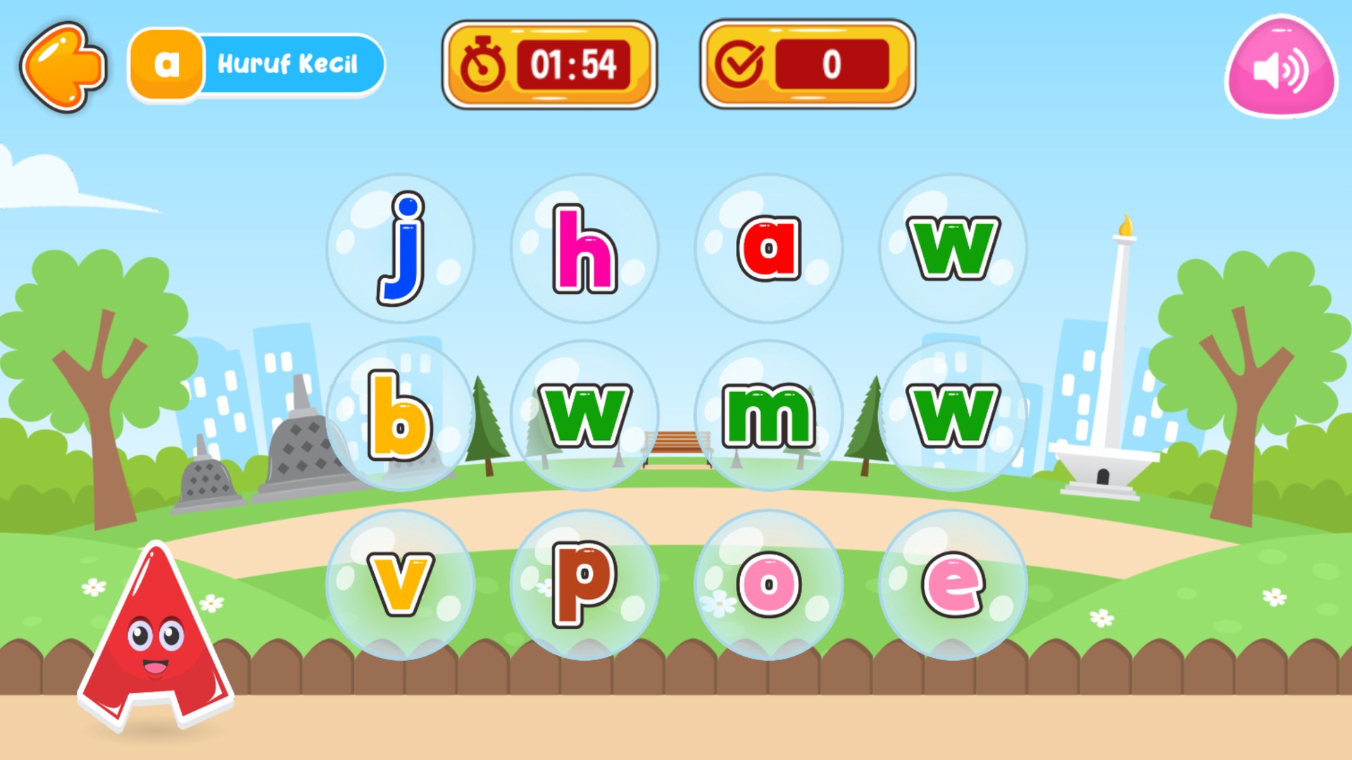 Pada pemainan ini anak-anak akan belajar mengenal huruf alfabet A sampai Z. Konsep pembelajaran pada aplikasi ini dirancang secara interaktif disertai permainan menarik dan suara yang menarik sehingga anak-anak tidak bosan saat bermain.