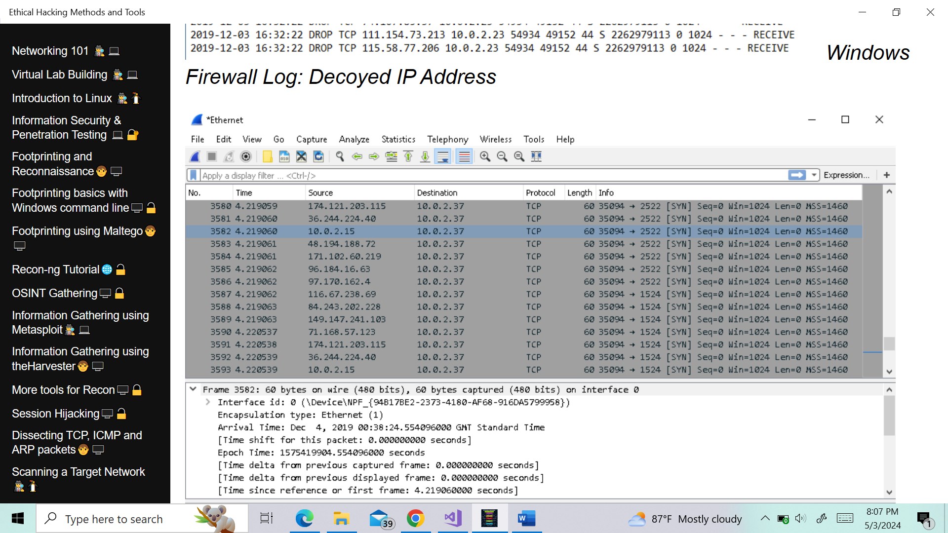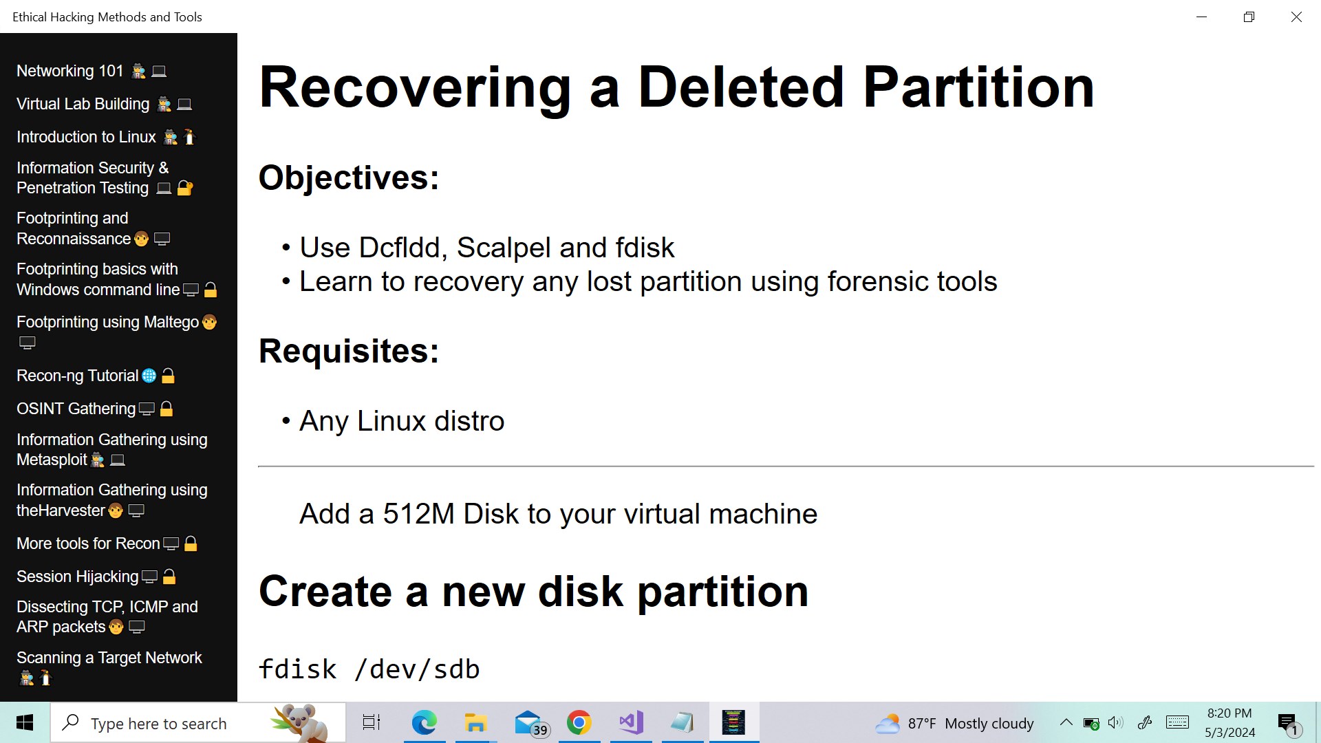 Footprinting and ReconnaissanceFootprinting using MaltegoScanning a Target NetworkSession HijackingInformation gathering using theHarvesterNetwork Troubleshooting using MegaPingRecovering a deleted partitionGrabing ICMP PacketsPort Scanning and Active Host Scanning