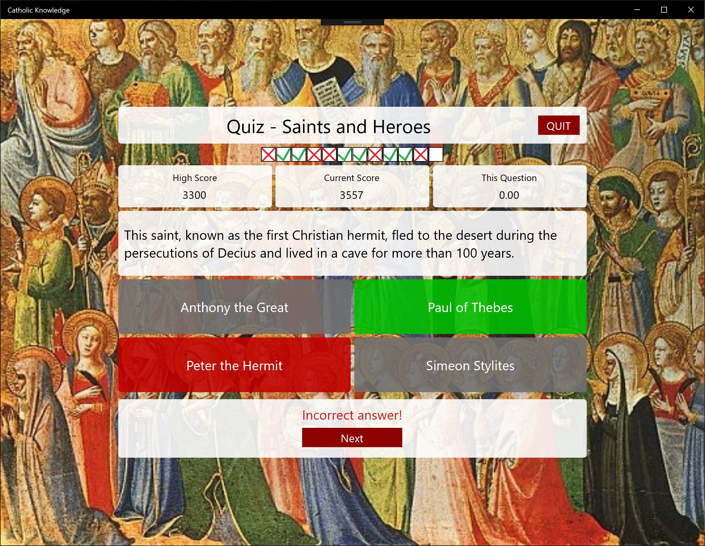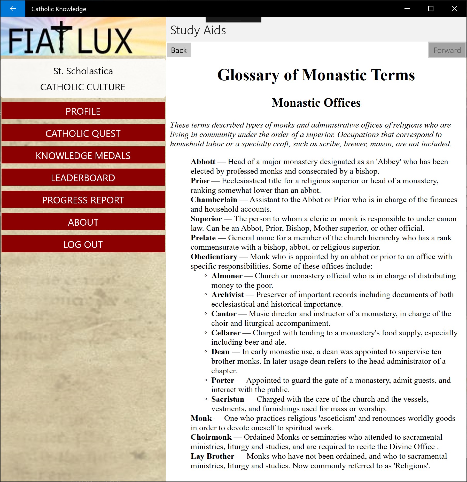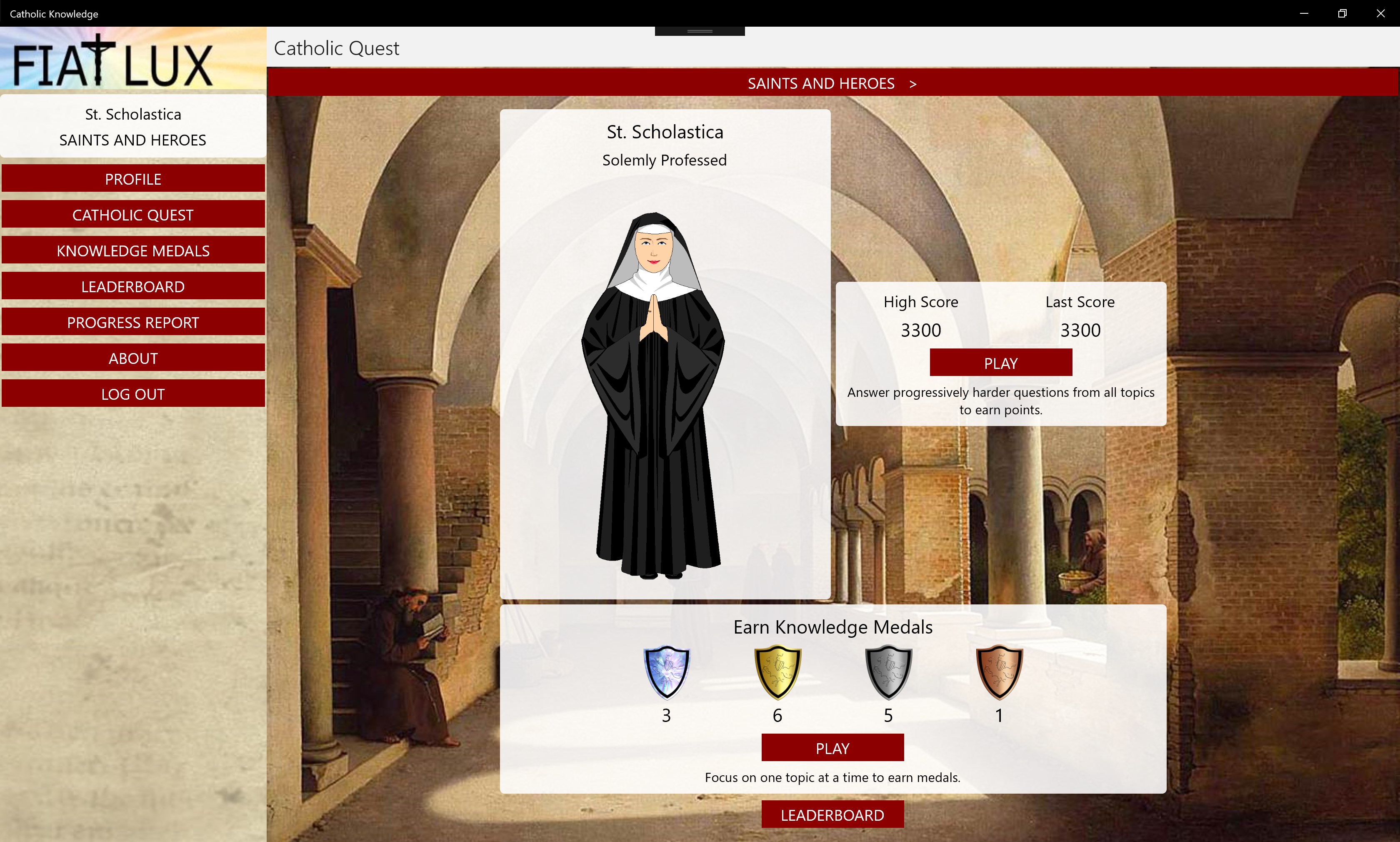The Catholic Knowledge quiz program can be used in two ways. The "Catholic Quest" game allows students to answer questions from an entire program category and earn points depending on both speed and difficulty. Students can compete against members of their own study group or against all Catholic Knowledge users.