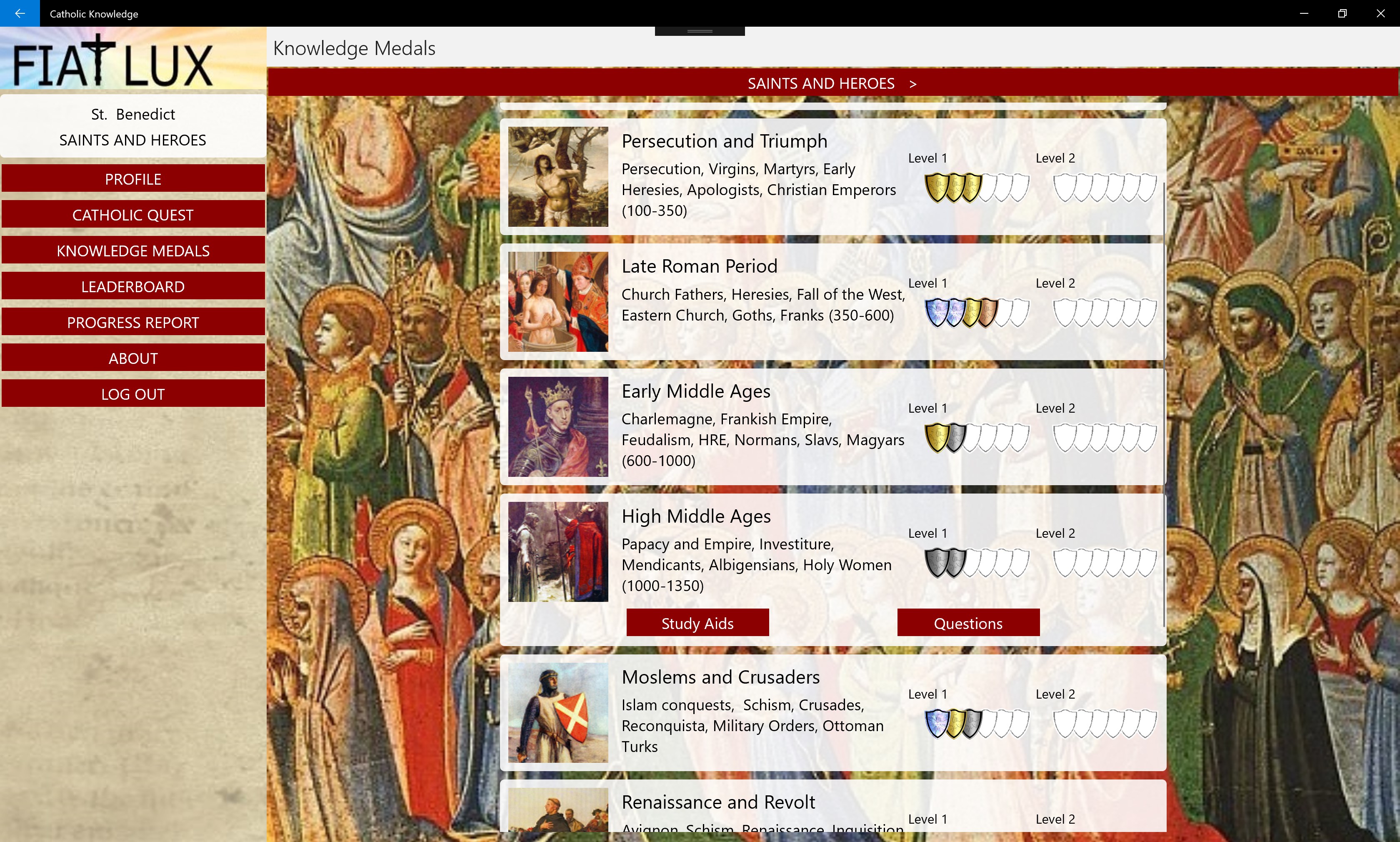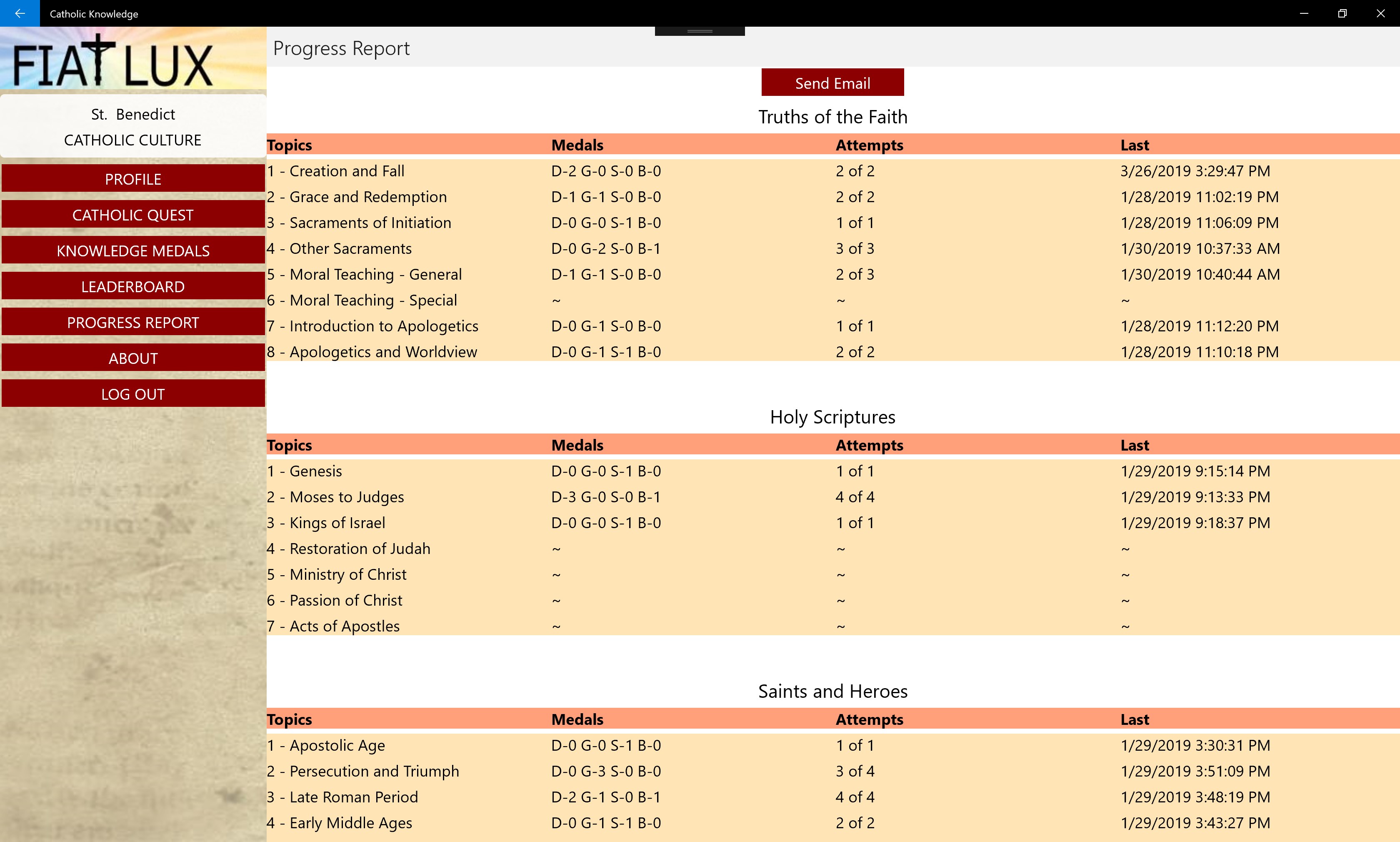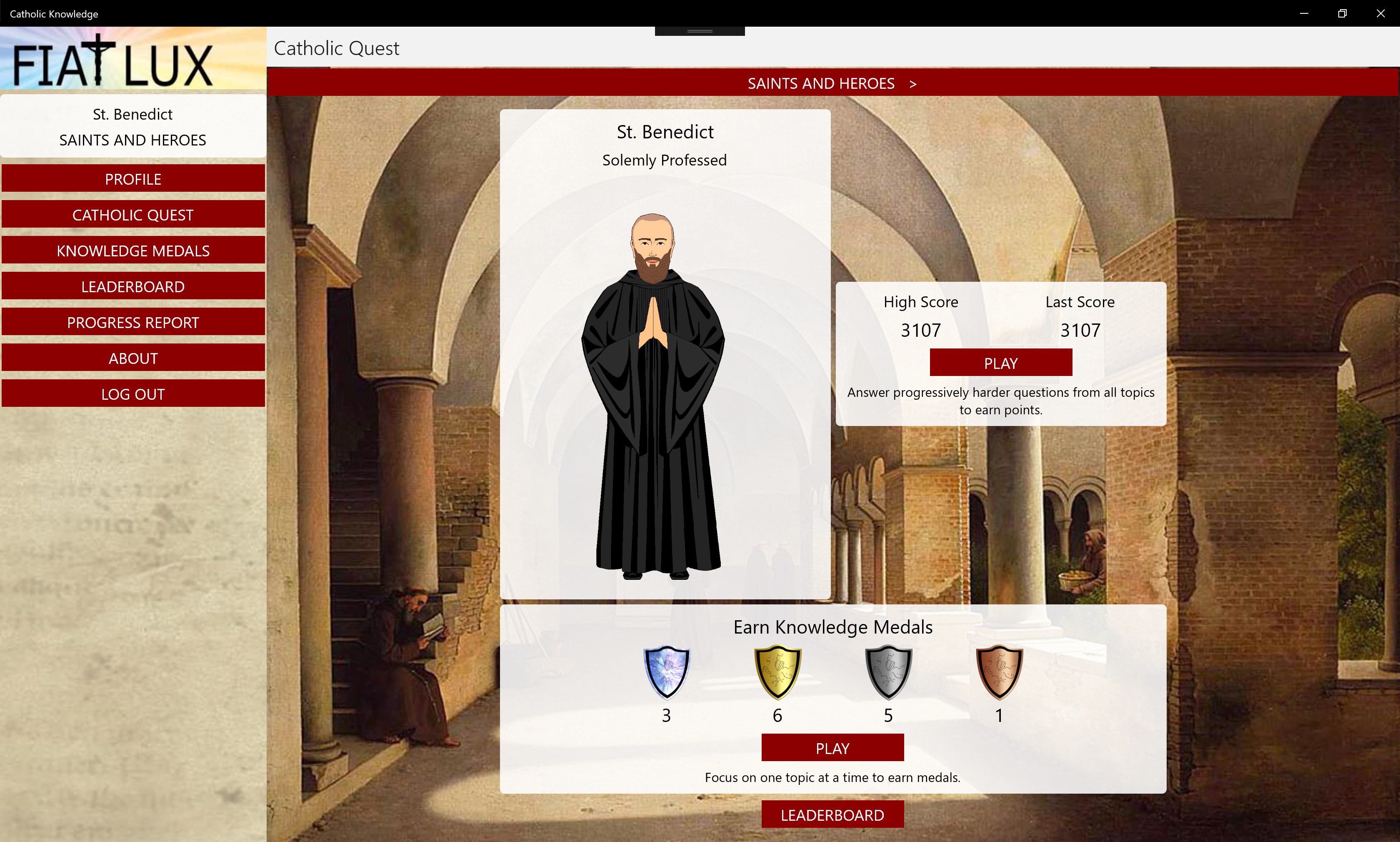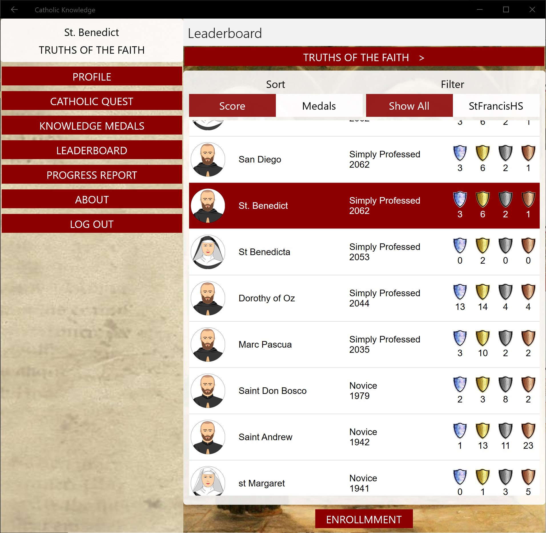 Students who would like to compete by posting their scores and medals can enroll on a Catholic Knowledge "Leaderboard". Separate leaderboards are provided for each major program category and can be organized by total points or medals earned.