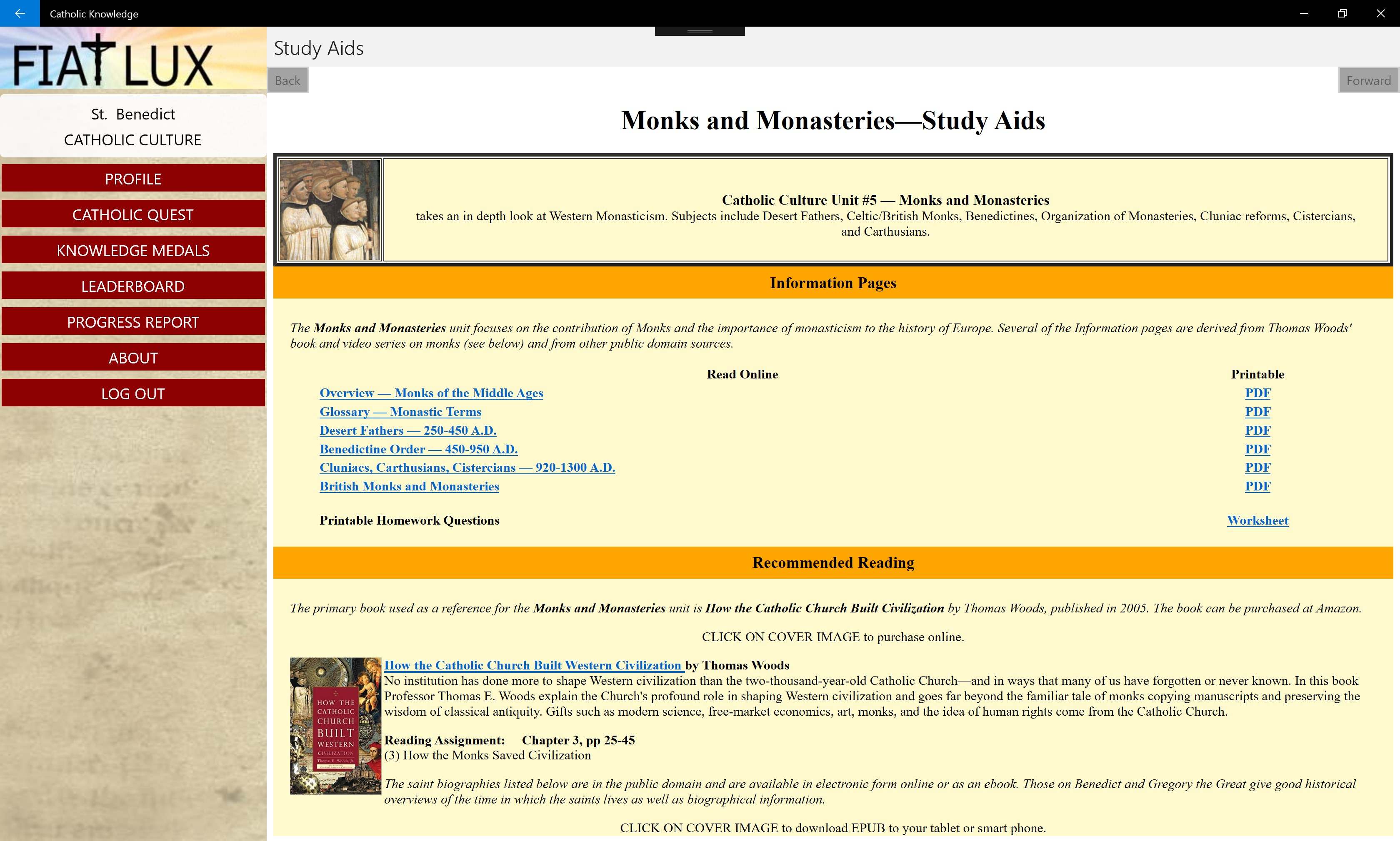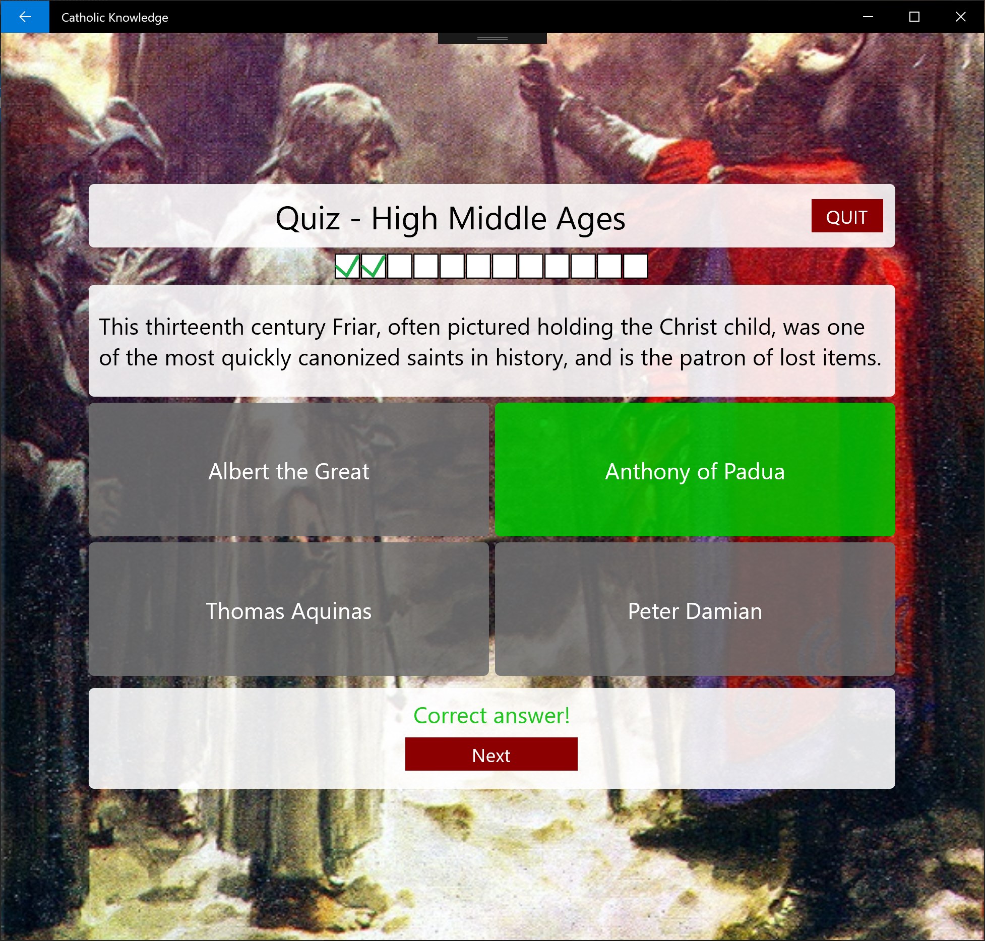 Catholic Knowledge is a quiz program created to help introduce students to the truths of the faith and the important achievements of Christian civilization. Our resources include hundreds of pages of study aids and over 3000 multiple choice questions covering Catholic catechism, scriptures, saints, history, tradition and culture.
