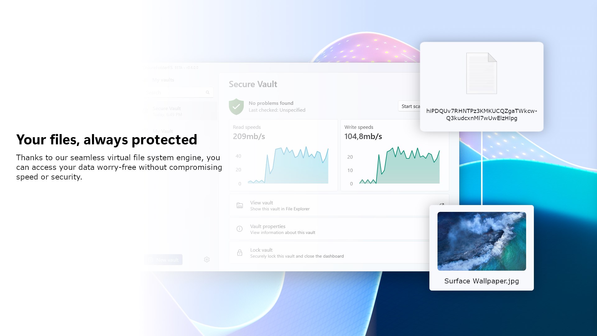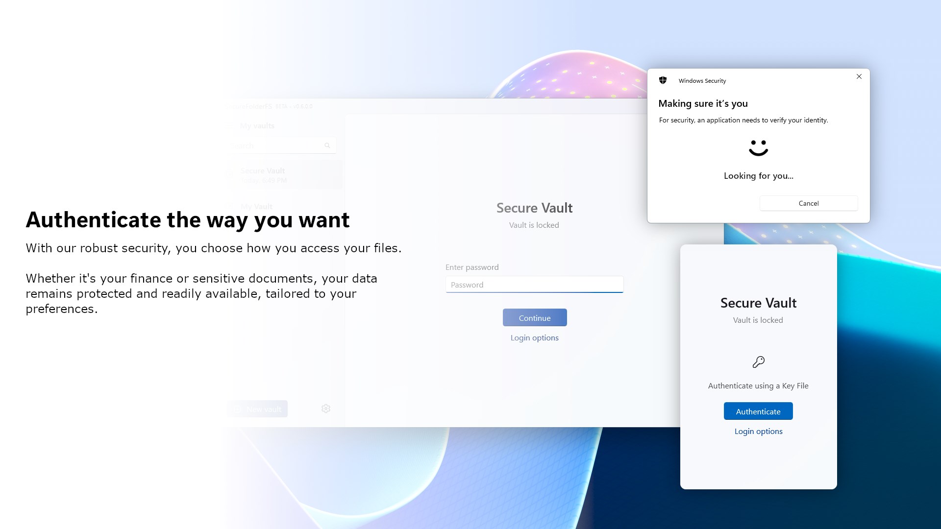 AES file name encryptionSeamless, on-demand decryptionCloud storage readyTwo-factor authentication with Windows HelloStrong AES-GCM or XChaCha20 content encryption