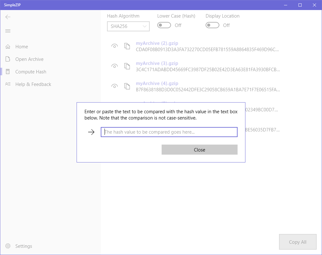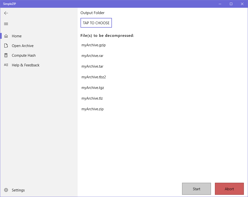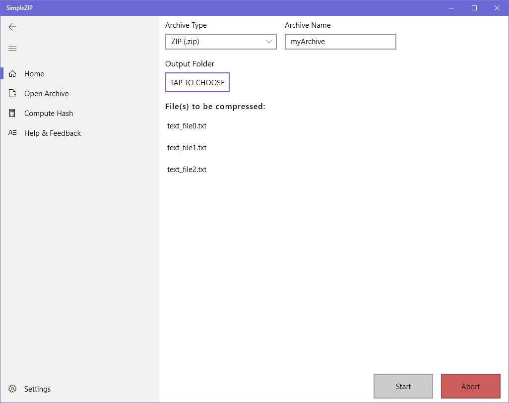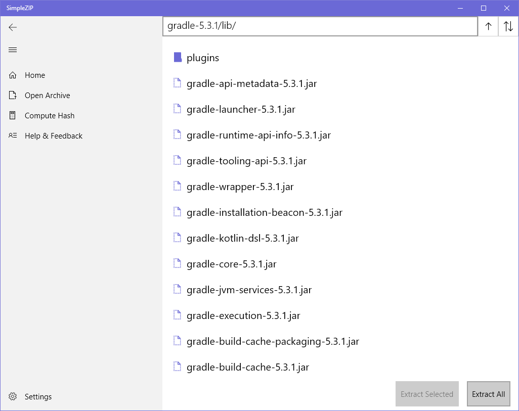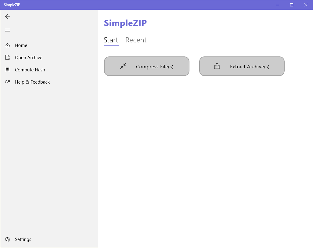 SimpleZIP is an easy to use application for creating, extracting and browsing archives. Furthermore, SimpleZIP is able to compute hash values of files (message digest). Archives can be created using several formats: