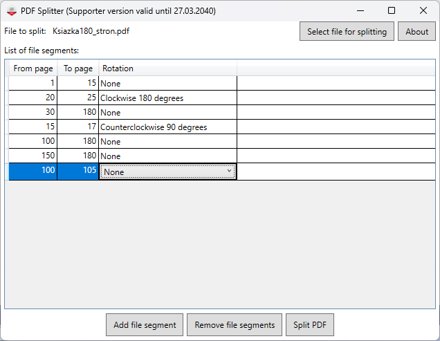It is a program that allows you to easily and quickly split PDF file. Three simple steps are needed, to split PDF document into separate documents. First, we must add file you would like to split to the program. This can be done using the Add file button. Then you need to provide information which pages should be extracted. The last step is splitting file. To do this, click Split PDF button.