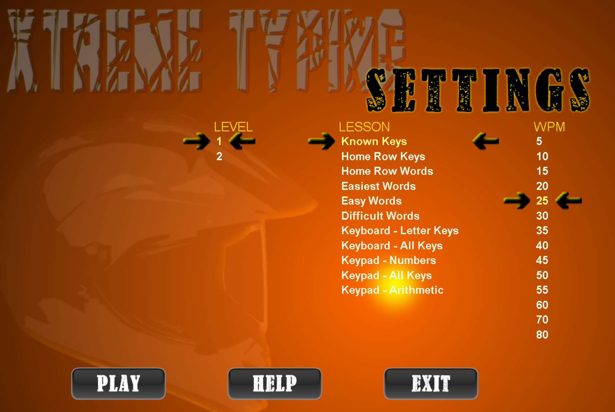 This fast-moving, action game will keep your fingers on the keyboard as you move your motorcycle across the desert and through the heart of the city. Type accurately and faster than your target words per minute and watch a motorcycle stunt fest! Your bike will make several jumps, fly off ramps, roll over limousines, and fly over buses. See if you can accelerate your bike through each level of the course and get to the finish line. If you type fast and accurately, you will see a grand finale stunt at the end of the course!