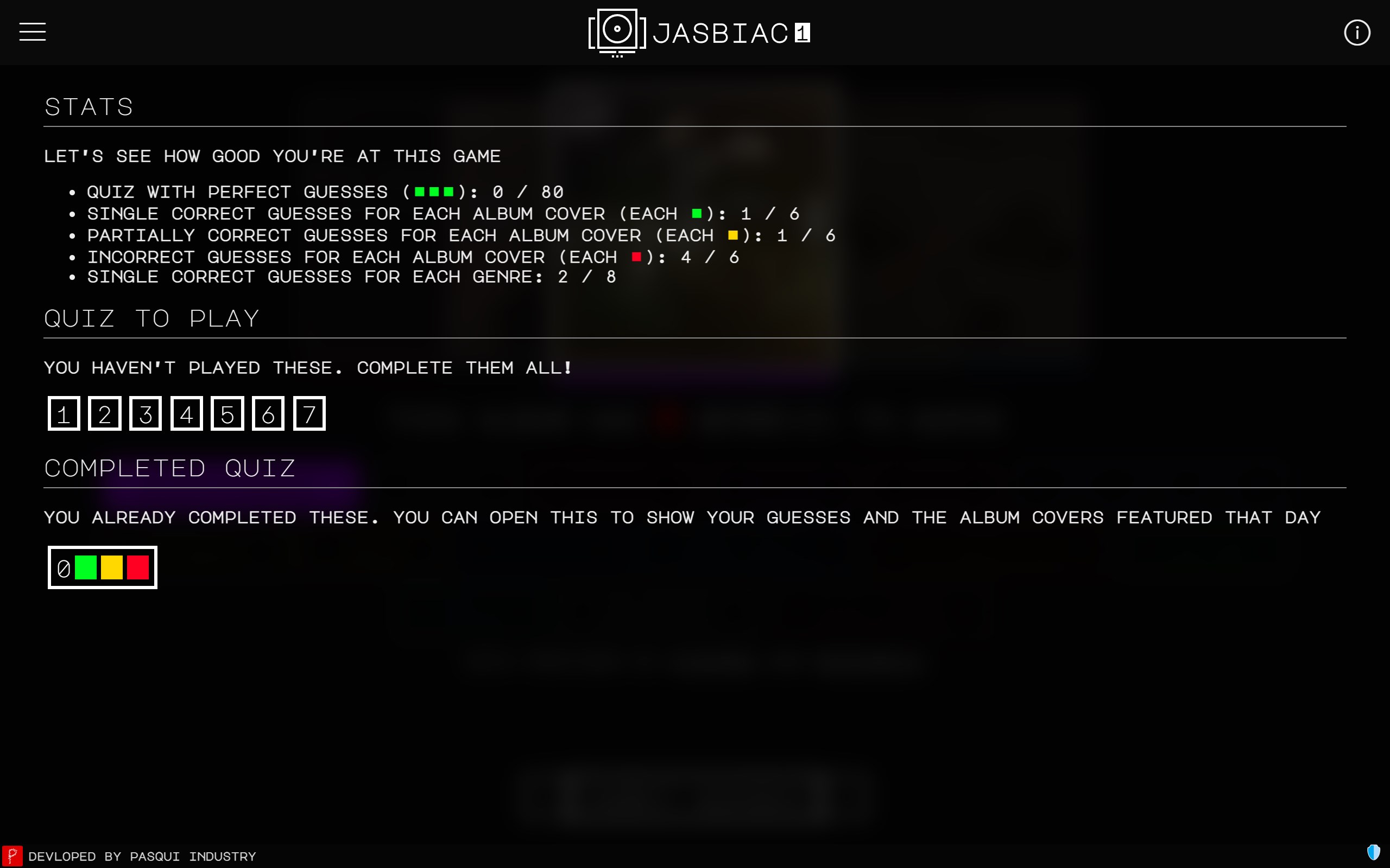 Judge A Song By Its Album Cover - or JASBIAC - it's a WordLe-Like. Every day you'll be able to guess the genre(s) of three albums just by looking at their cover art.