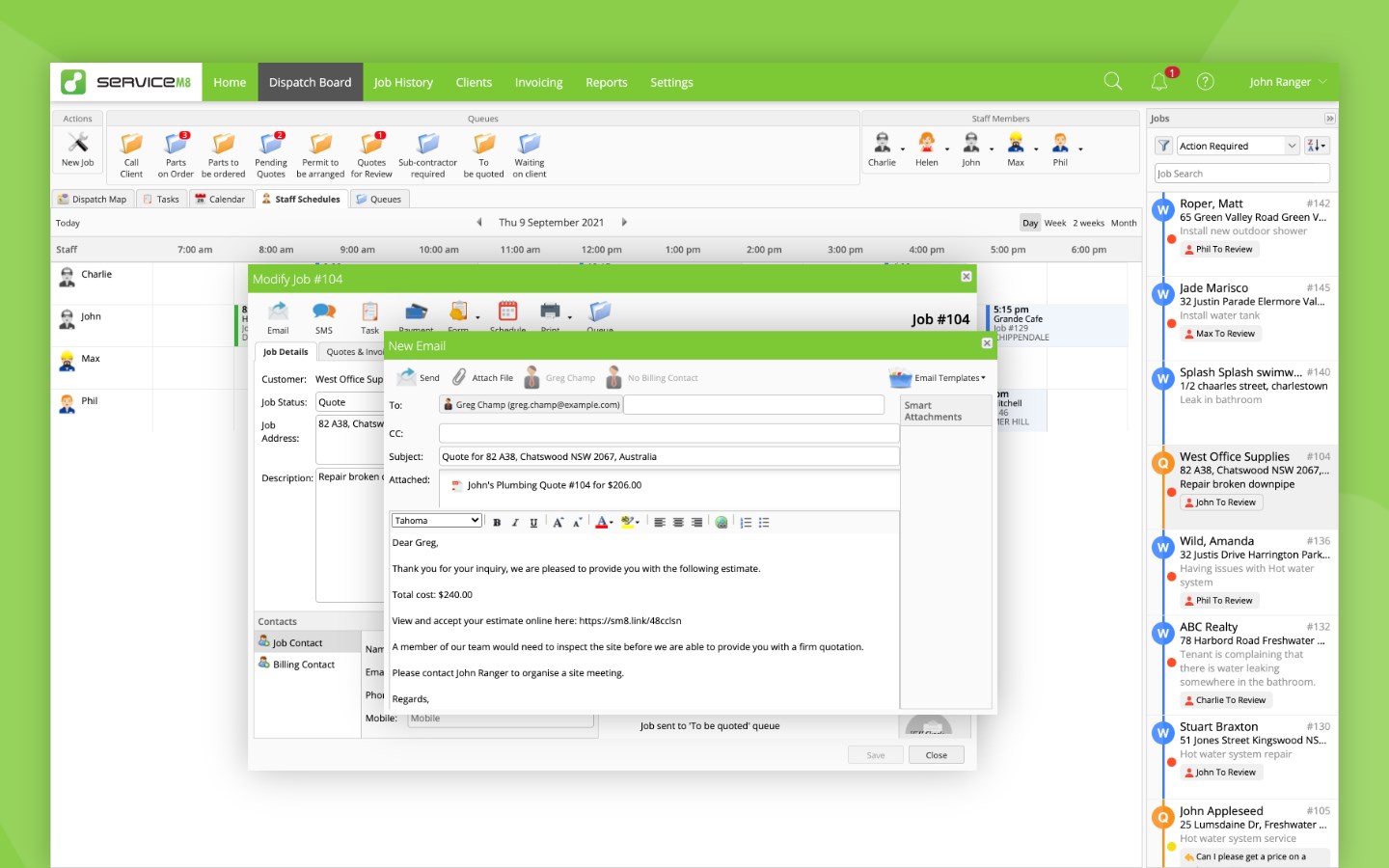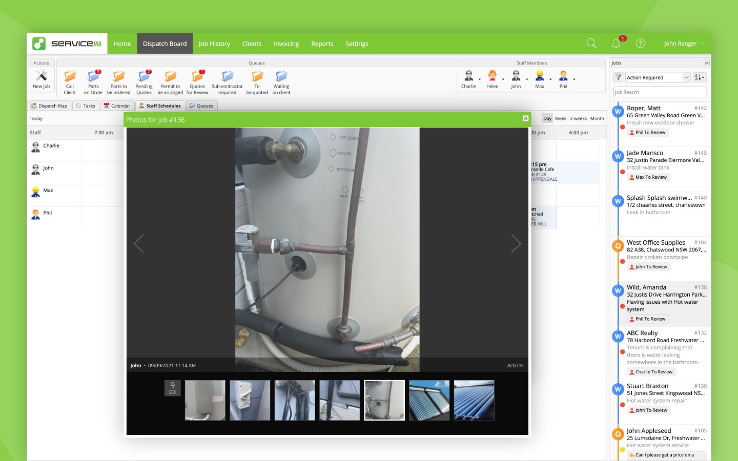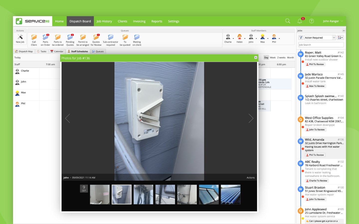 ServiceM8 is a job, staff & client management solution, with everything to run your day-to-day in one place — digital job cards, scheduling, quotes, staff locations, client emails & texts, job notes & photos, online bookings, forms, asset management, invoicing & payments.