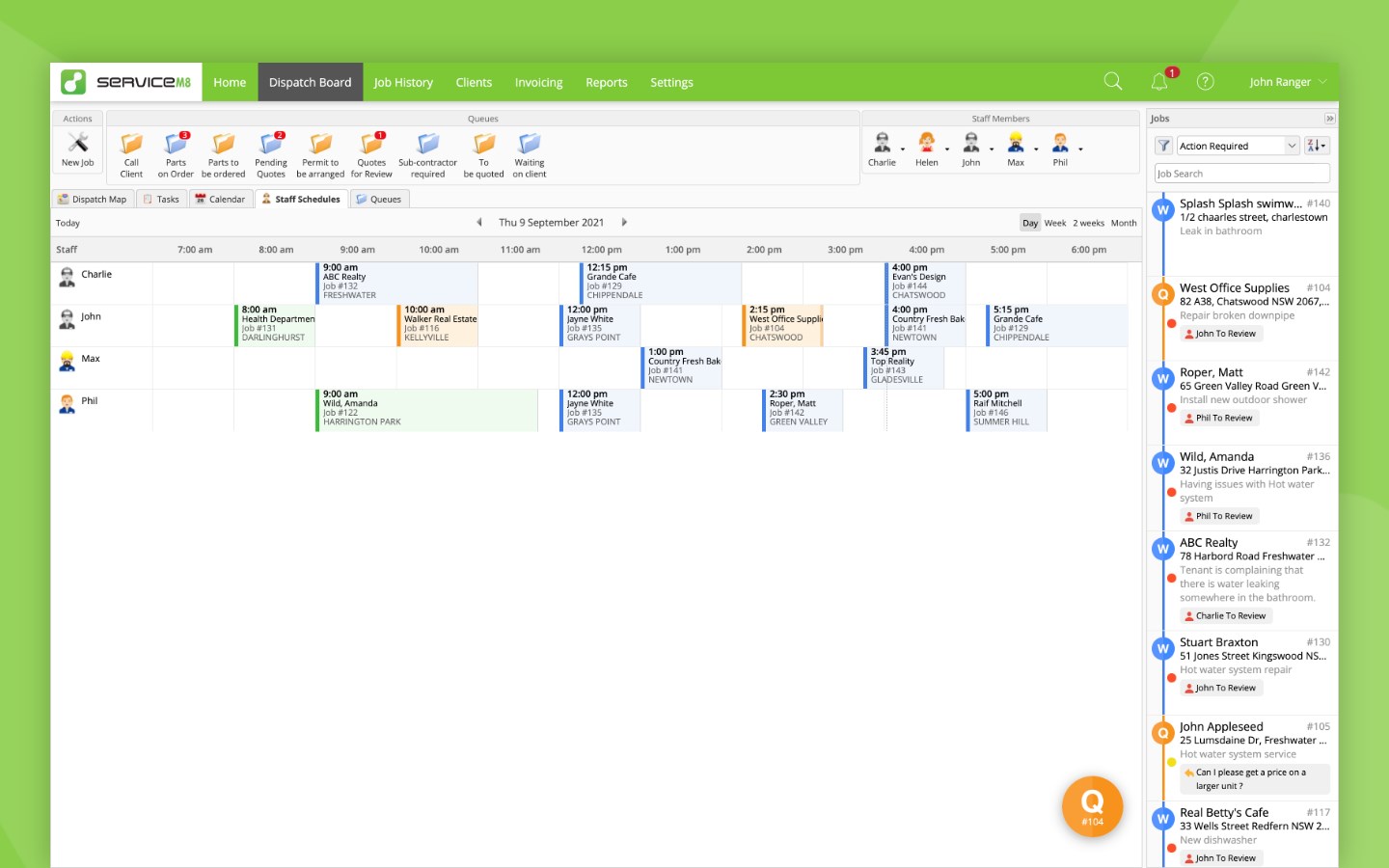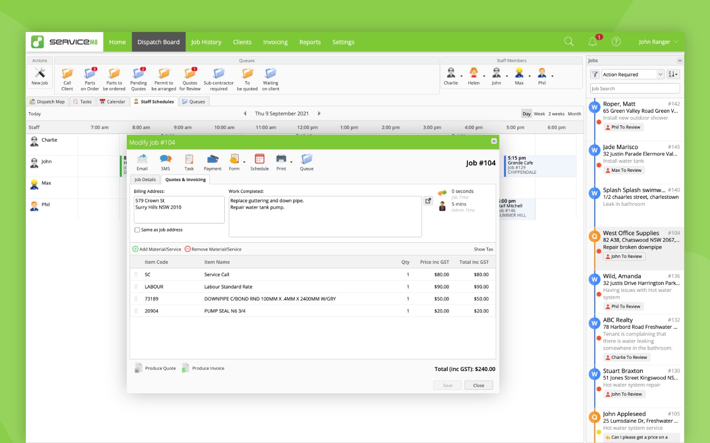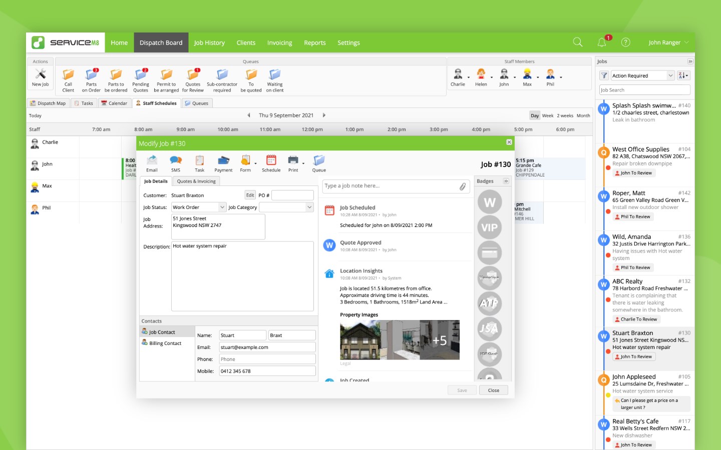 ServiceM8 is a job, staff & client management solution, with everything to run your day-to-day in one place — digital job cards, scheduling, quotes, staff locations, client emails & texts, job notes & photos, online bookings, forms, asset management, invoicing & payments.
