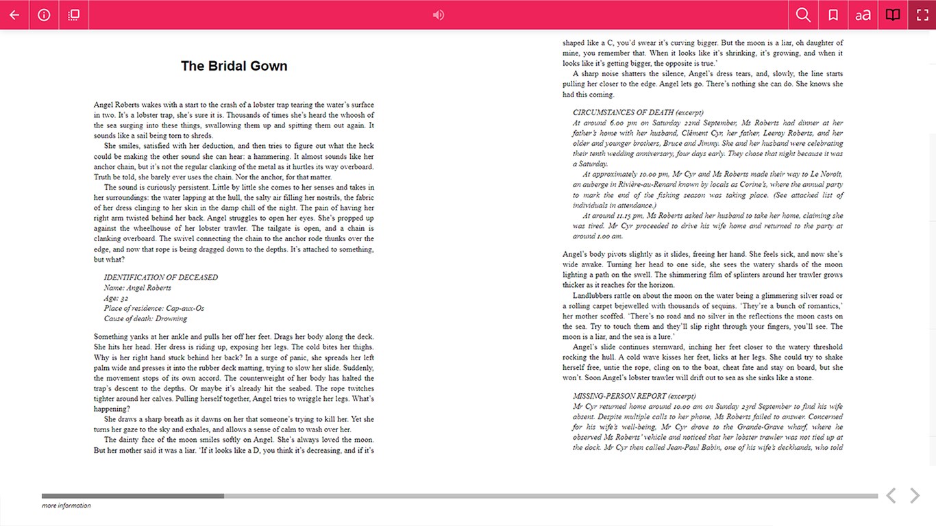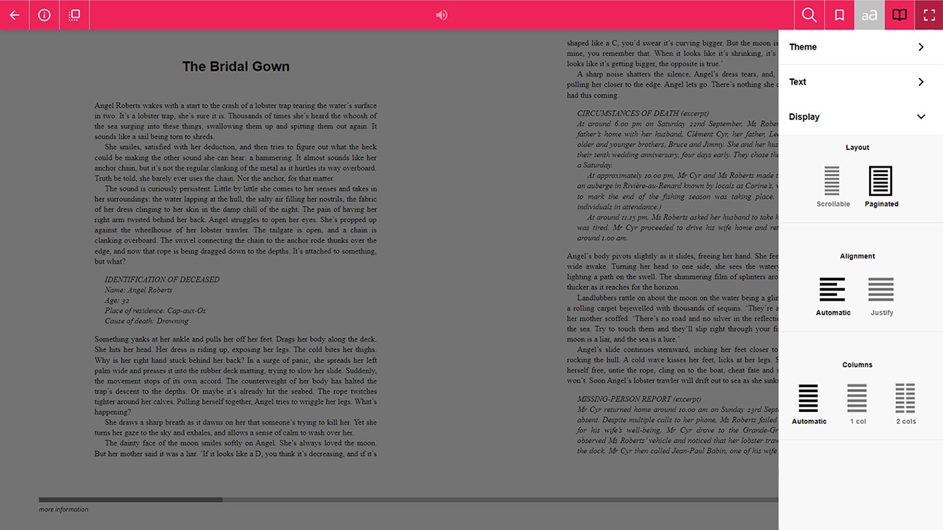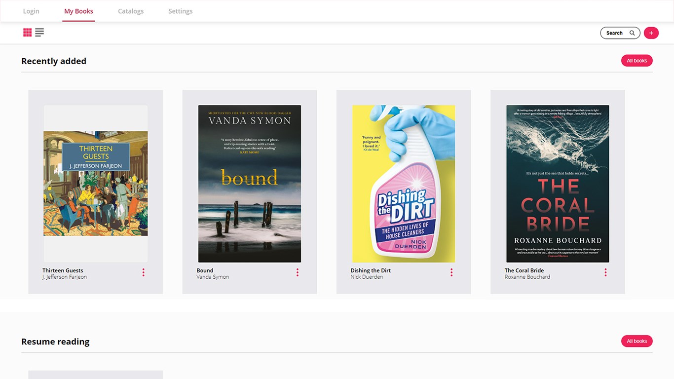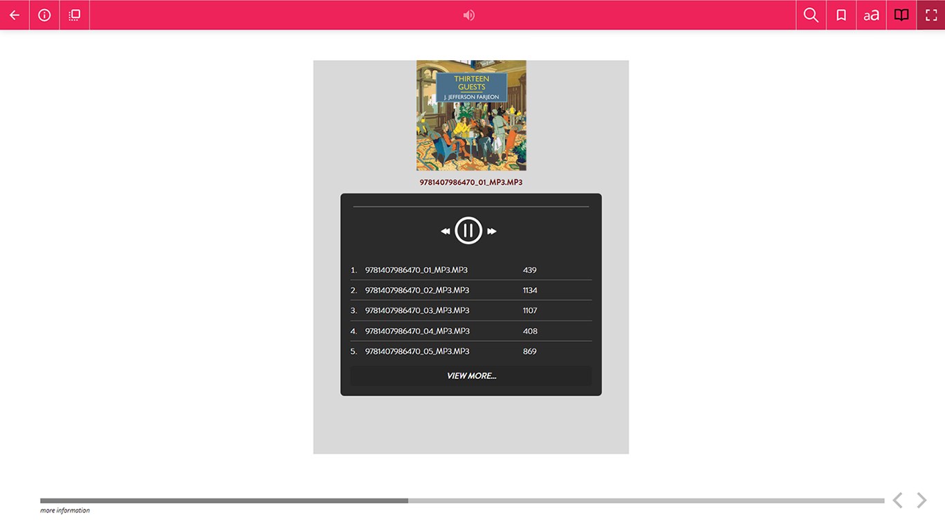 Audiobooks - download and store on your PCAudiobooks - play/pause and skip forward/backwardAudiobooks - listen in the background whilst browsing other appseBooks - download and store on your PCeBooks - page book-marking, opening the title at the right place when you pick upeBooks - change the font size, font face (including a dyslexic-friendy font), spacing and layout to suit your needs (depending on the features available in the eBook)eBooks - change the theme coloureBooks - display and navigate from the Table of Contents of the eBookeBooks - create and manage your own bookmarks within the texteBooks - read in either fullscreen view or window view