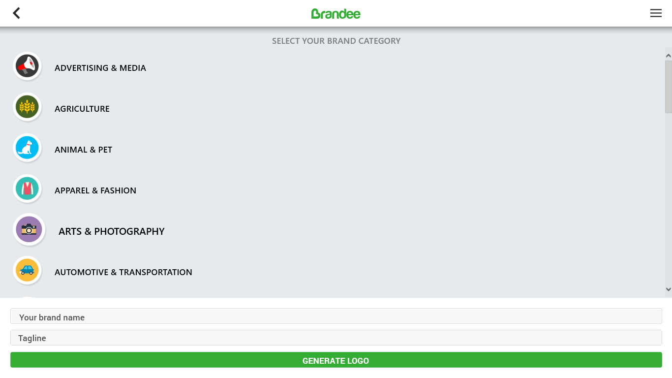 Open up the stylish logo creator. Pick a category, type in the name of your brand and a tagline and Brandee's Logo Generator auto magically generates several logos and graphics with beautiful texts and fonts customised to your brand. Then, edit and help design your own custom logo within a few minutes.