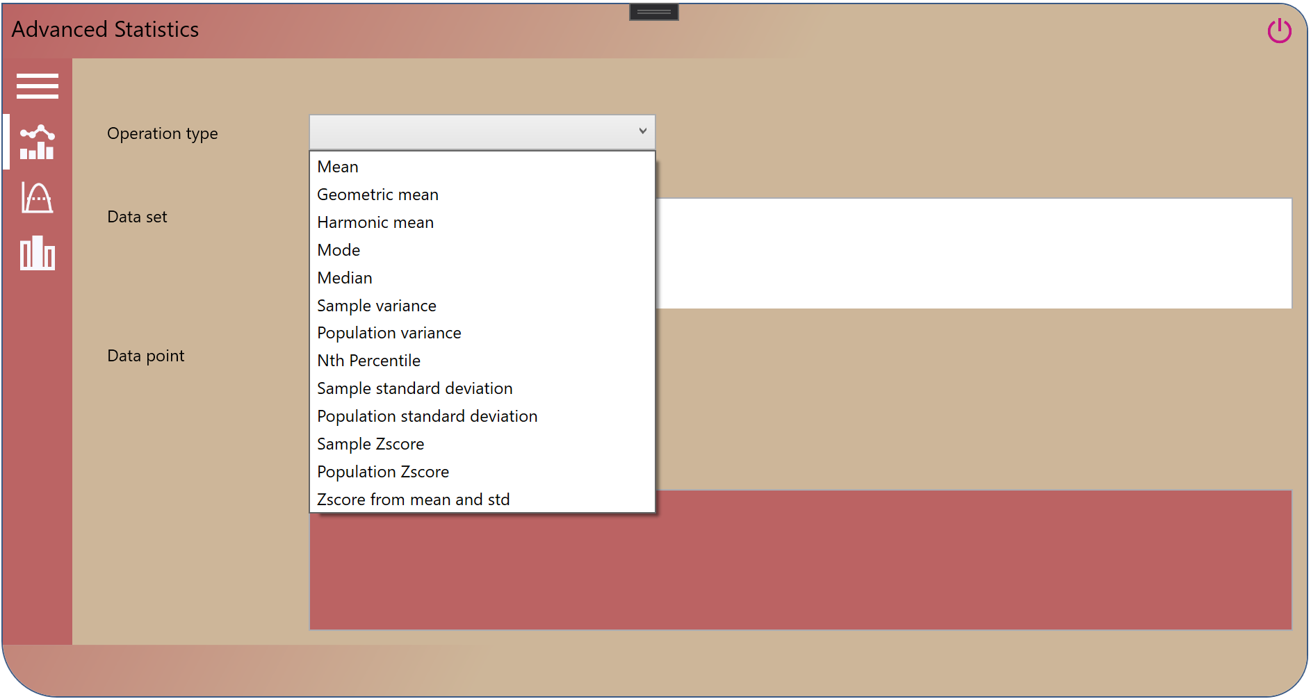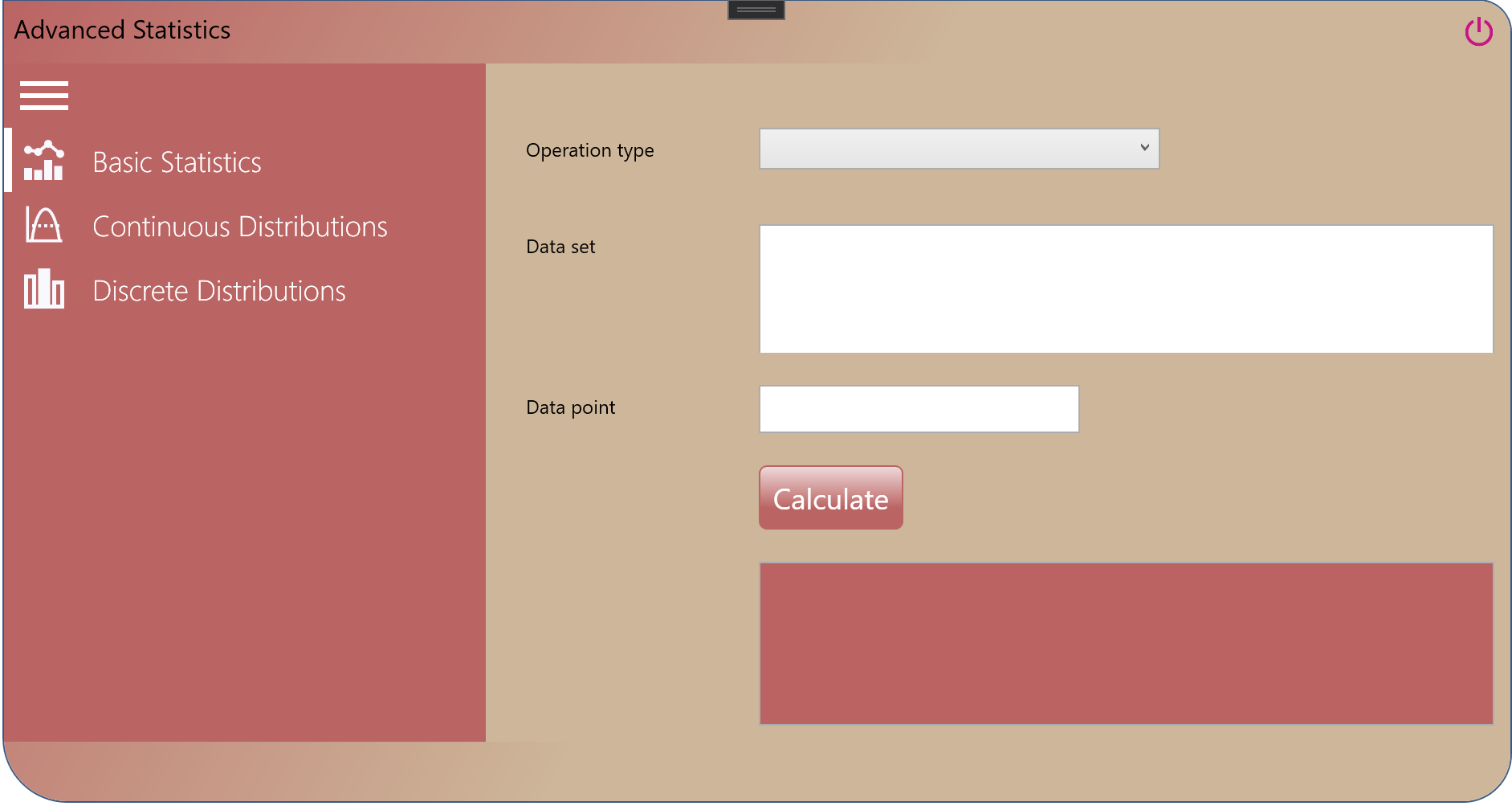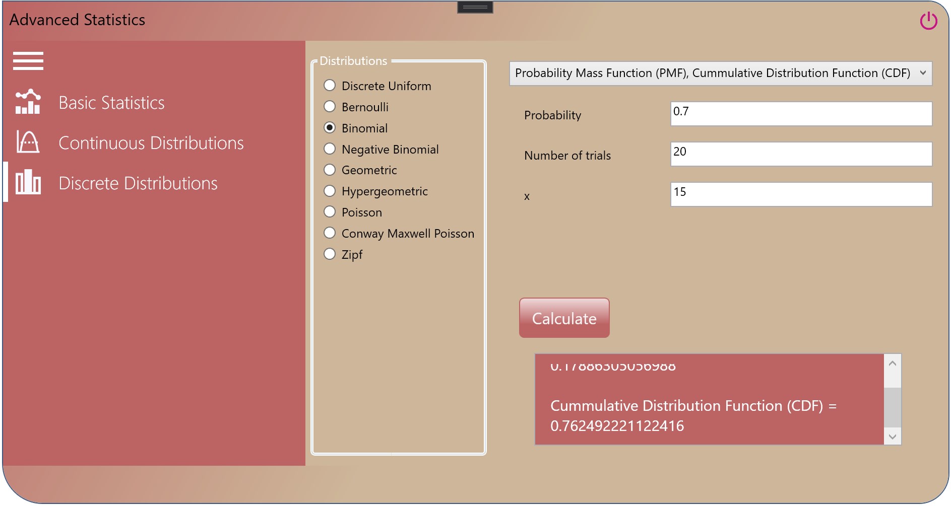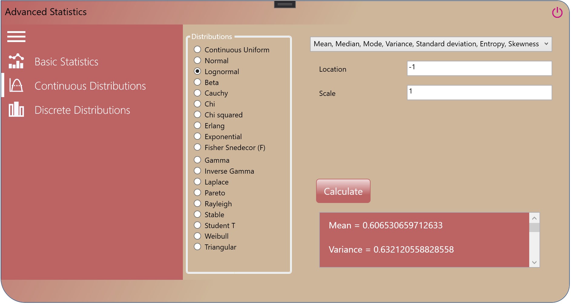 Advanced Statistics is an application that helps calculate different statistical functions. The application covers basic statistics such as mean, geometric mean, harmonic mean, median, standard deviation, mode of a sample and a population. It also covers discrete and continuous statistical distributions, therefore allowing to compute the mean, mode, median, entropy, variance, skewness, cumulative distribution function, probability density function, probability mass function of each distribution when applicable.