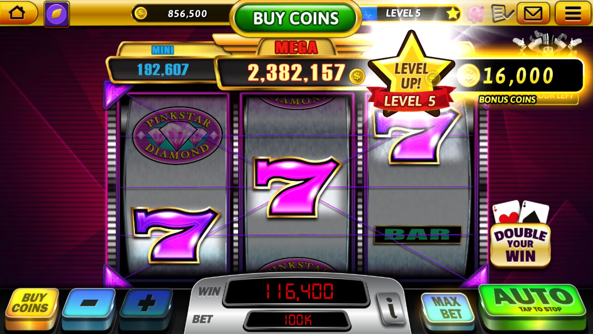 Experience the HOTTEST Vegas SlotsWin HUGE Rewards Everyday!Not just 777 Slots but the BEST Vegas casino Games! Video Poker, Blackjack, Roulette and Baccarat!Big Win TournamentsVIP Club