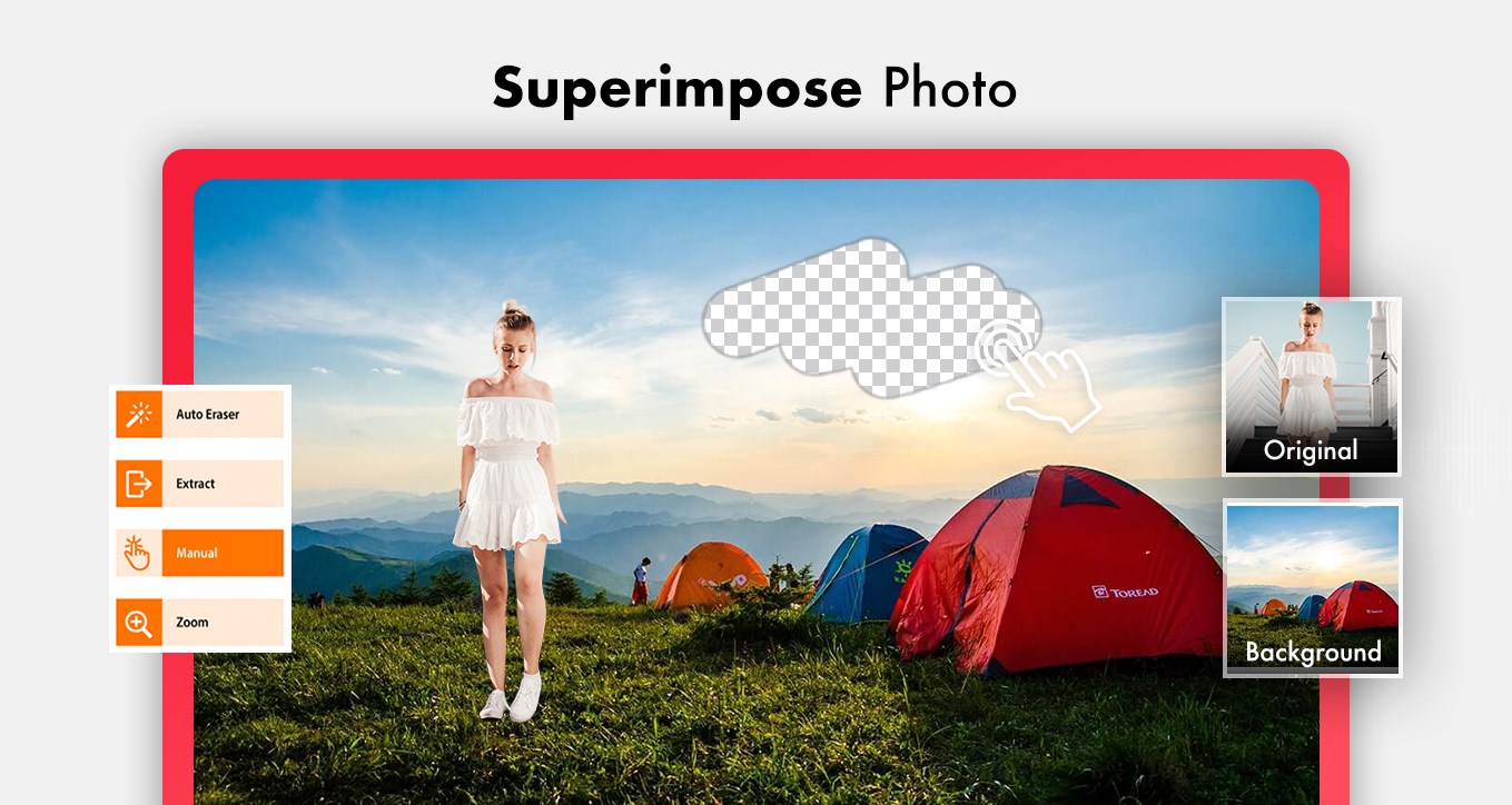 Use the cropped image as a stamp with the option to resize, rotate and change the position. Most of the background image is also erased automatically by auto option.