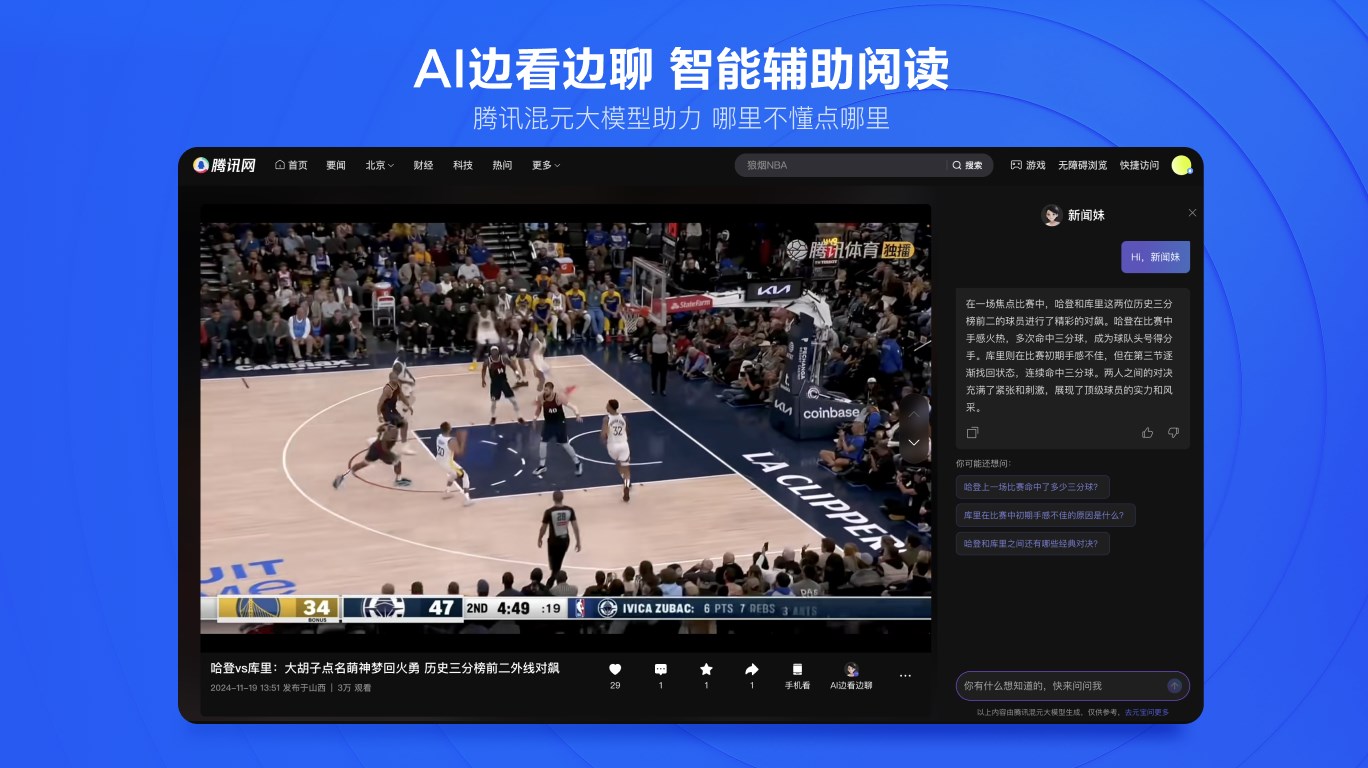 看热点新闻和视频、看NBA比赛直播、热门问答、评论互动