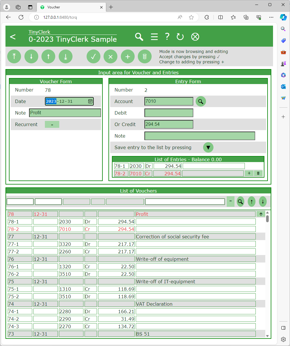 TinyClerk is an easy to use double-entry bookkeeping application. It is designed for the entrepreneur, consultant, free-lancer or small-business owner who wants to do his own bookkeeping. TinyClerk is single-user, off-line, standalone and secure. It is available for Windows and Android, the data can be shared with multiple devices and across platforms. There are two products available at the both appstores: TinyClerk and TinyClerkFree. They are the same from v1.2.0, which removed all the restrictions from TinyClerkFree. If you want to support the development buy the payable app TinyClerk.