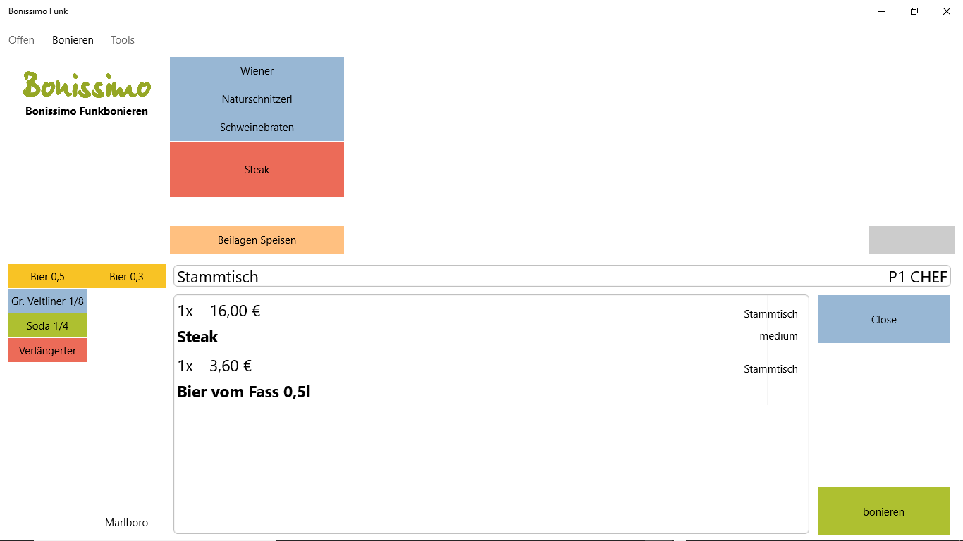 Mit Bonissimo Funkbonierung können Sie mobil bonieren und Rechnungen schreiben. Die Artikelanordnung und Bedienung sind dem Kassensystem sehr ähnlich. Für die Mitarbeiter sind keine langwierigen, zusätzlichen Einschulungen notwendig. Die Bedienung ist so, wie Sie es von der Kasse gewohnt sind.