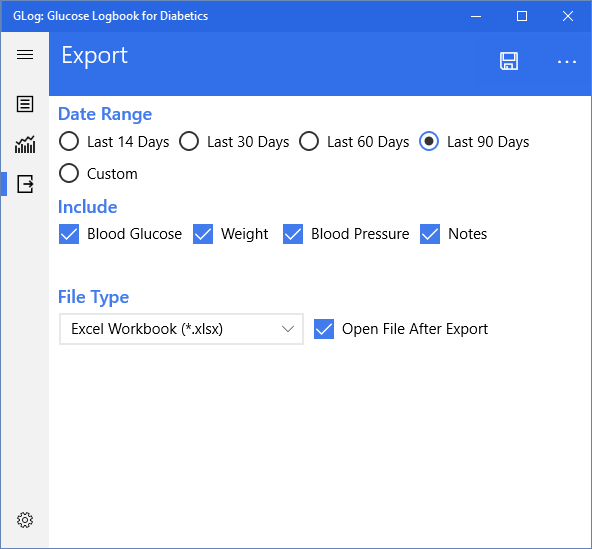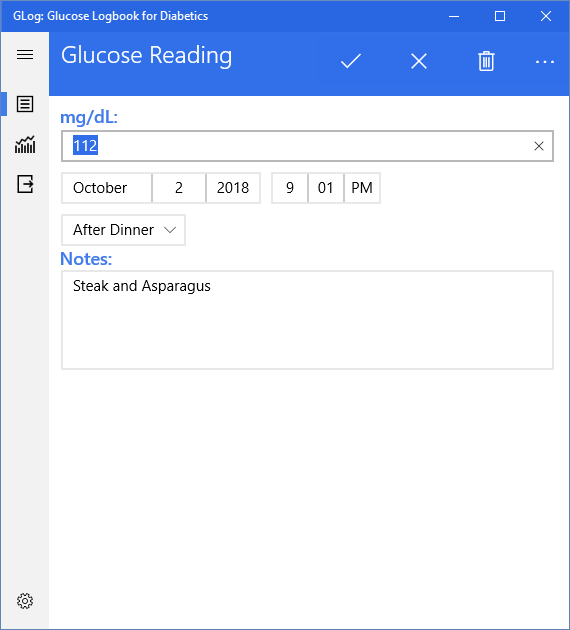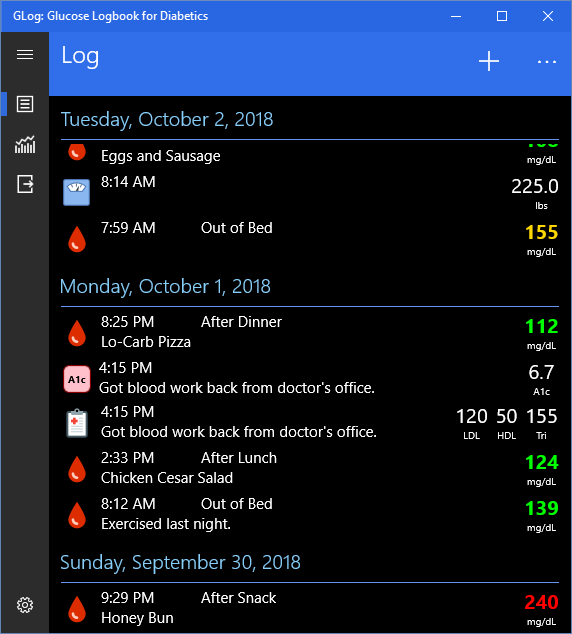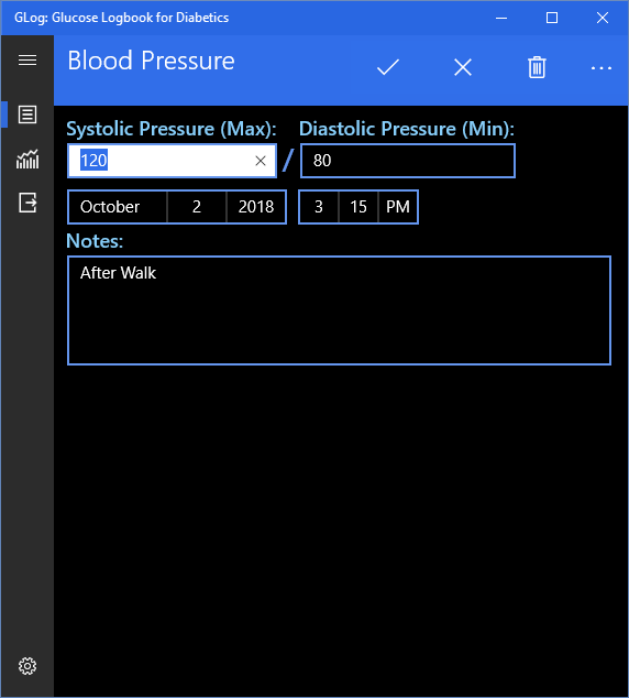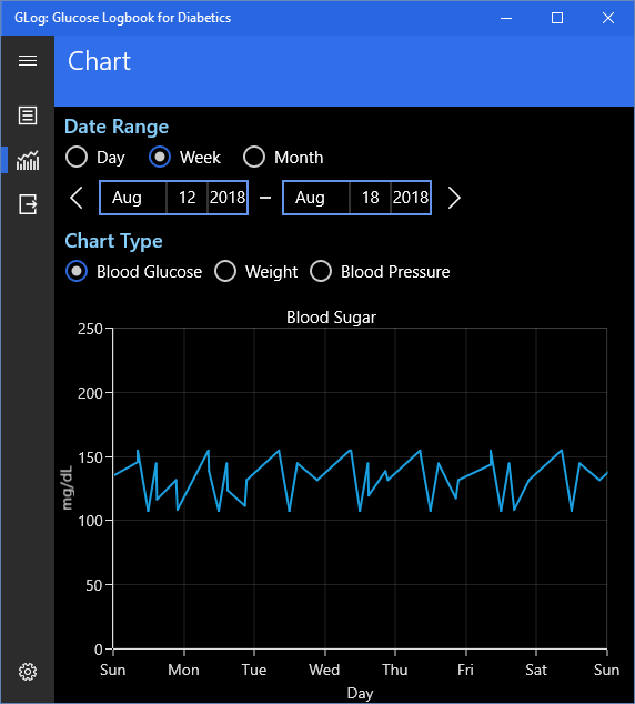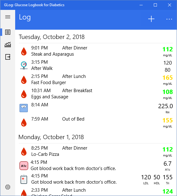 Modern Windows 10 style user interface.Quickly record blood sugar readings.Also record weight, A1C, blood pressure, and cholesterol readings.Charts for glucose, weight and blood pressure with day, week and month views.Export data to Excel and CSV formats.Light and Dark Themes SupportedSee the Average, Minimum and Maximum values for glucose, weight and pressure.Record data in mmol/L, kilograms, and mmol/mol as well as mg/dL, pounds and %.