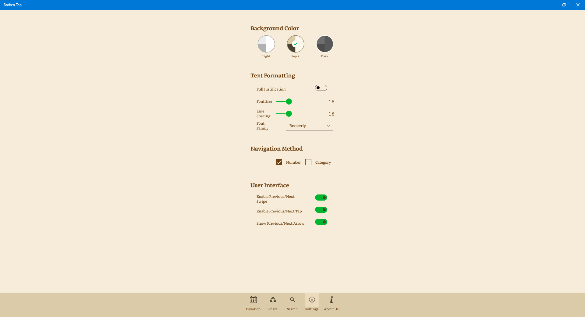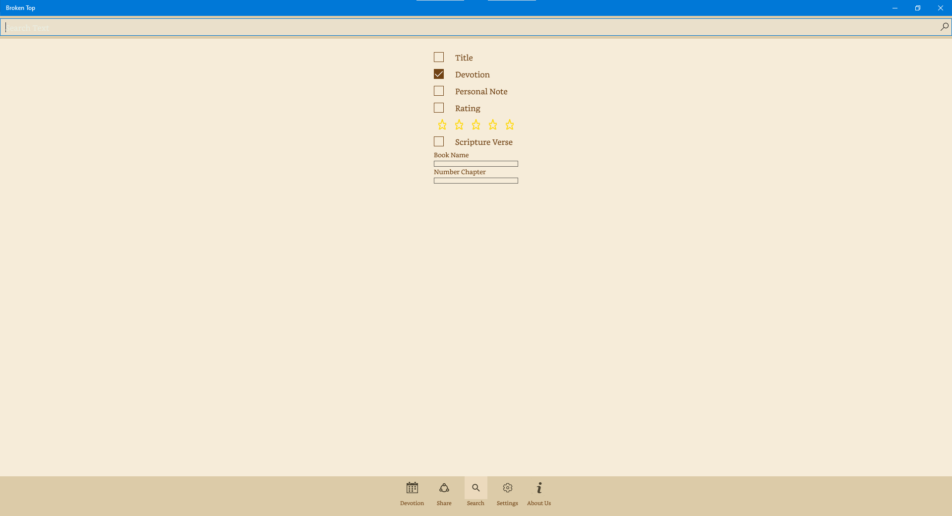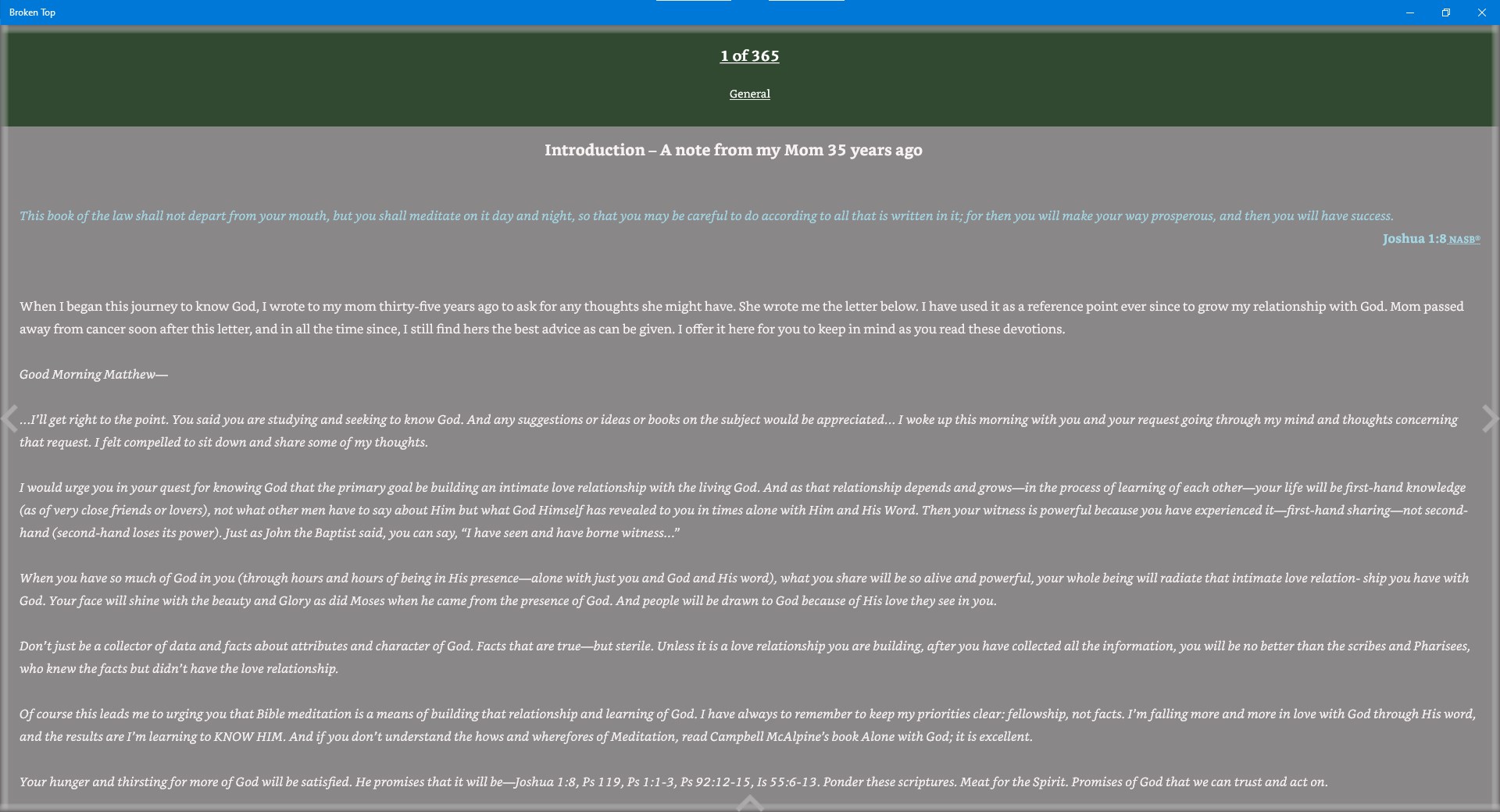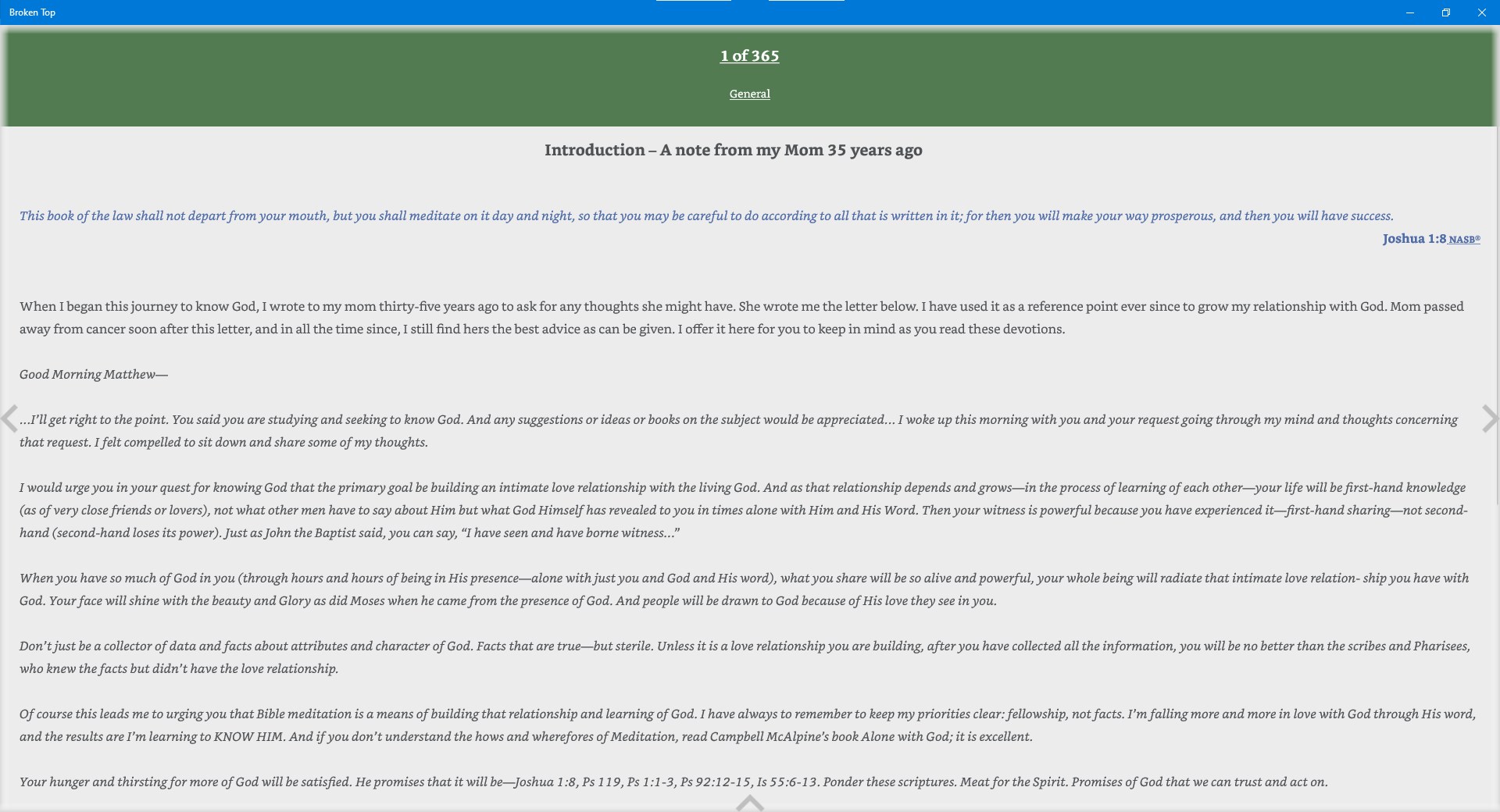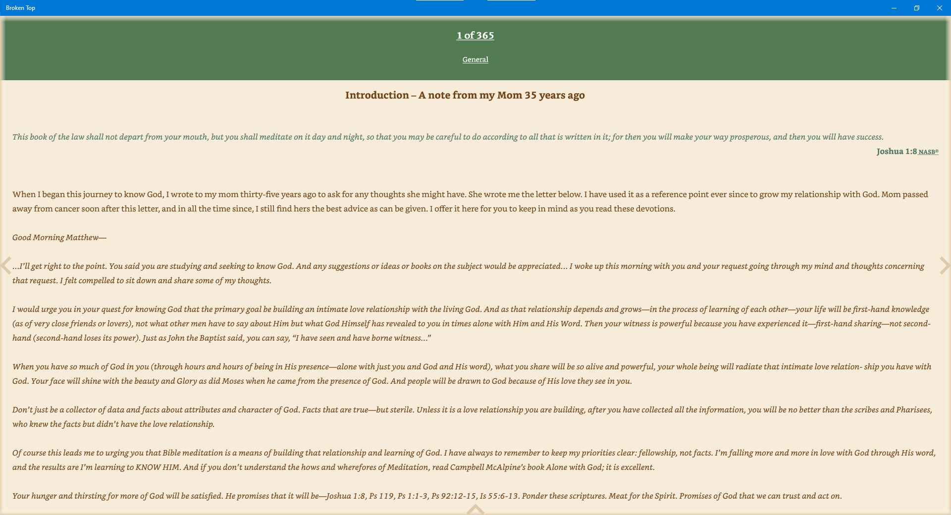 730 devotions written with the heart in mind. You can download the app, called 'Broken Top' in the Store.