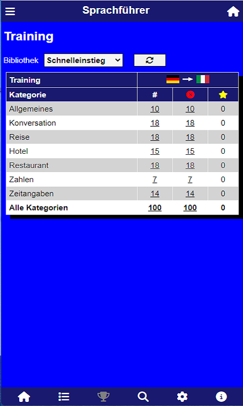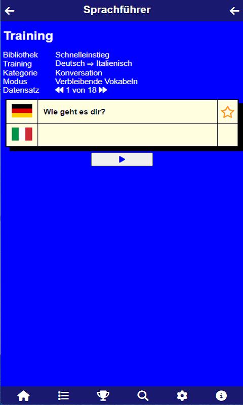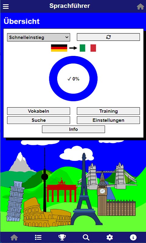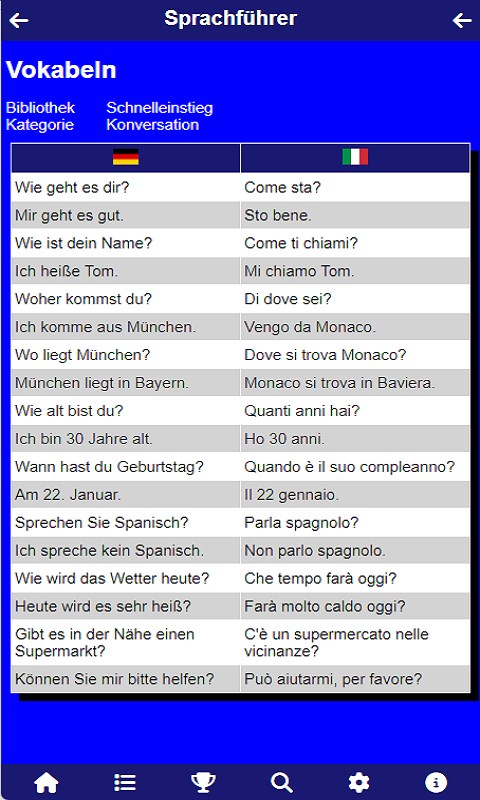 Phrasebook for different languages: German, English, French, Spanish, Italian, Swedish, Dutch, Polish Selection of home language and target language Selection of different language libraries: quick start (100 words), phrasebook (500 words), basic vocabulary (1500 words)Two different learning modes: vocabulary (table view) and training (individual query)Results are saved locally on the deviceOffline mode is supported