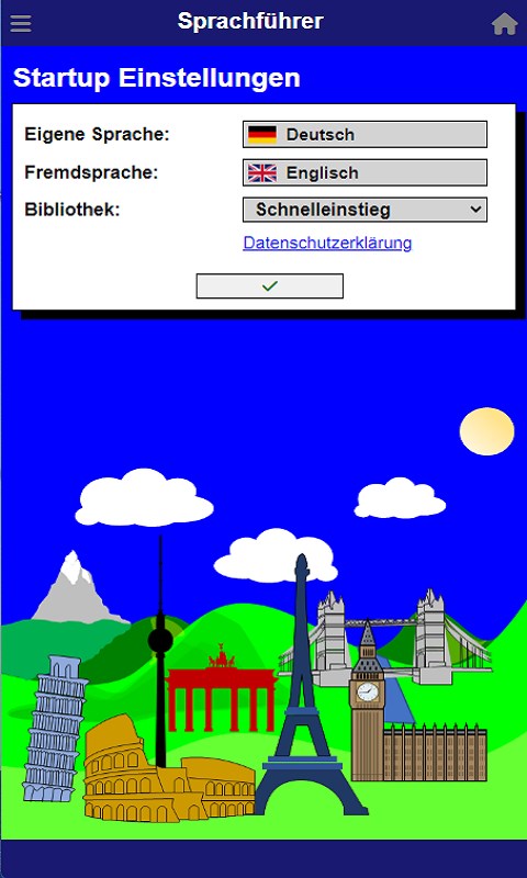 The phrasebook "Hello Europe" can be used to learn vocabulary and idioms of different languages (German, English, French, Spanish, Italian, Swedish, Dutch, Polish). The home language and the target language can be selected. Various language libraries are available. The programme is optimised for Google Chrome.