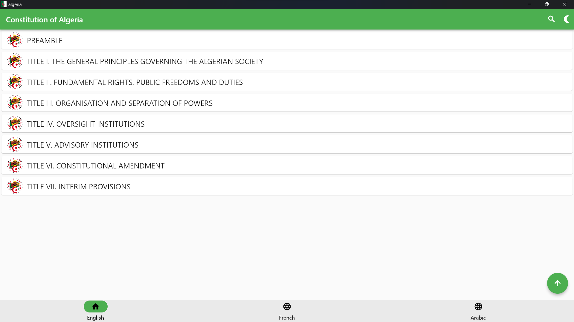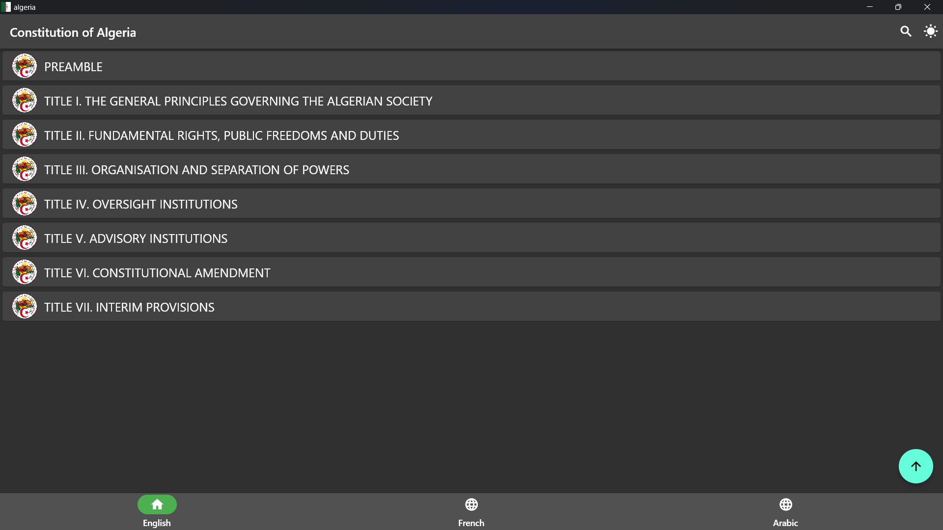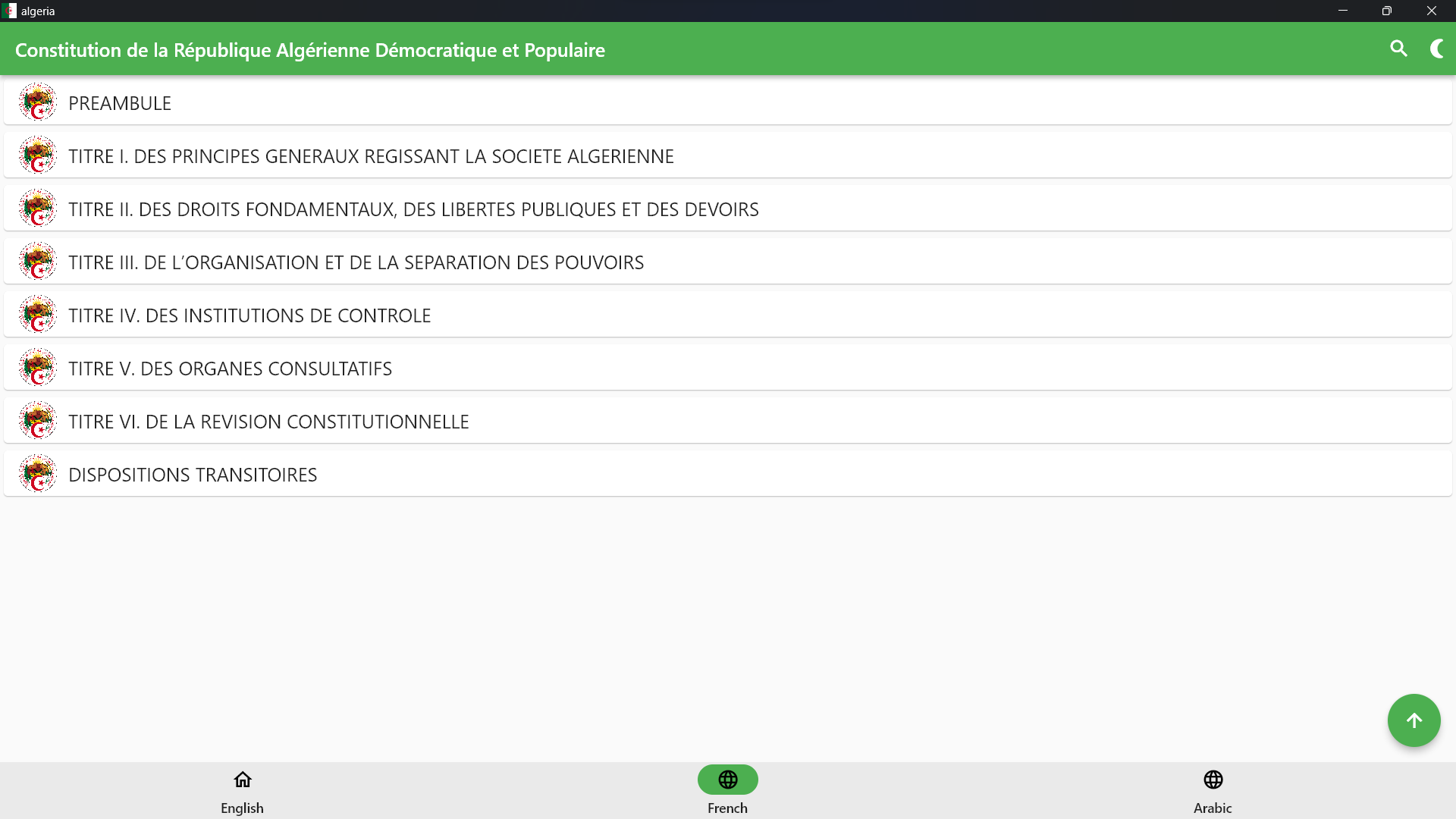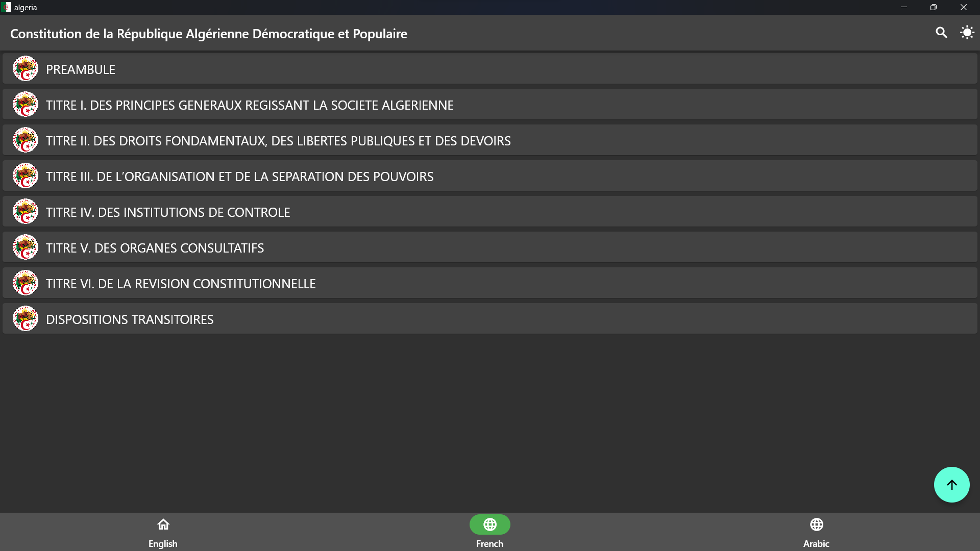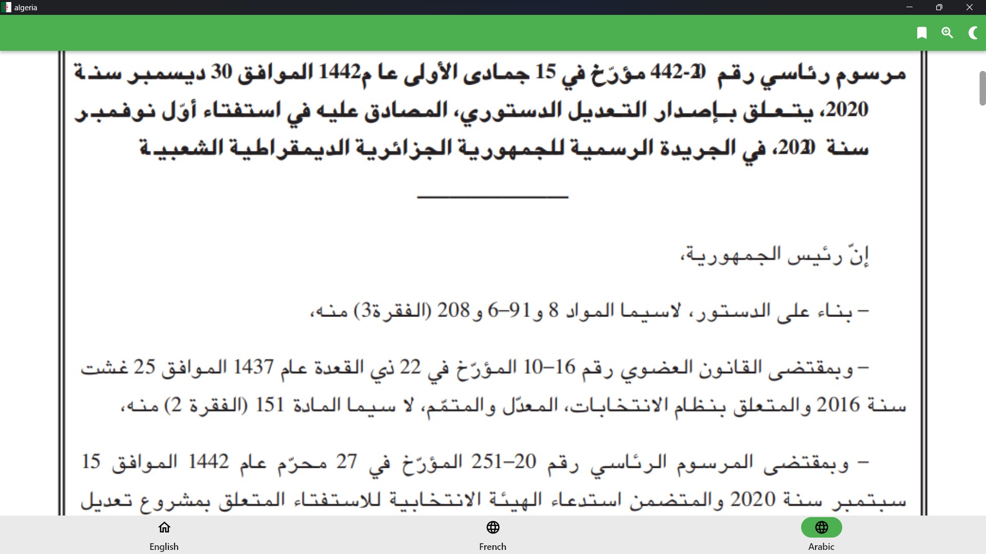 This application contains the Constitution of the Republic of Algeria 2020 in English, Arabic, and French.