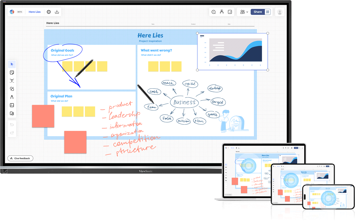 Build diagrams like flowcharts and mind maps with pen, shape, line, and text tools. Annotate various file types like PDF, PPT, and DOC using a connected Microsoft OneDrive (for Business) or a local drive. Search images, icons, and GIPHY animations for more creative options to collaborate or make a meeting fun. Presenters can use a laser pointer to draw an audience\'s attention to key parts of a presentation. Leave comments for other board users to review asynchronously. You can also initiate a vote to let collaborators decide on the best ideas and plans. Add sticky notes to share and review feedback. These tools work seamlessly in in-person and hybrid meetings.