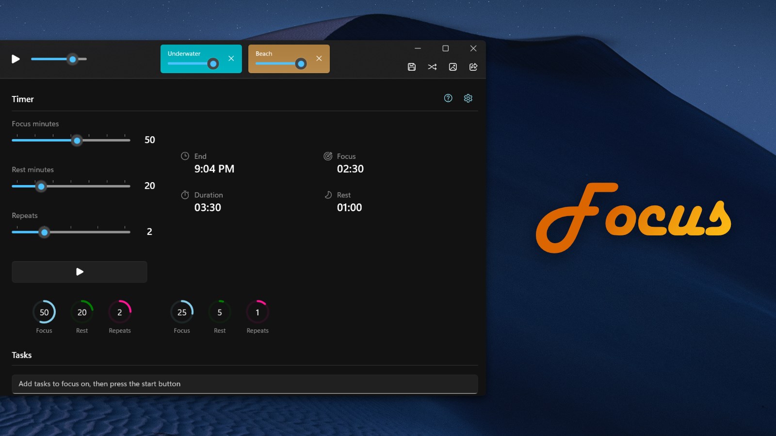 Take your productivity into new heights by using our innovative Focus Timer. Configure your focus and rest intervals and let Ambie guide you in your customized Focus Sessions. These sessions are designed to help keep you concentrated on your task, and we'll remind you to take an occasional break to keep your mind fresh.