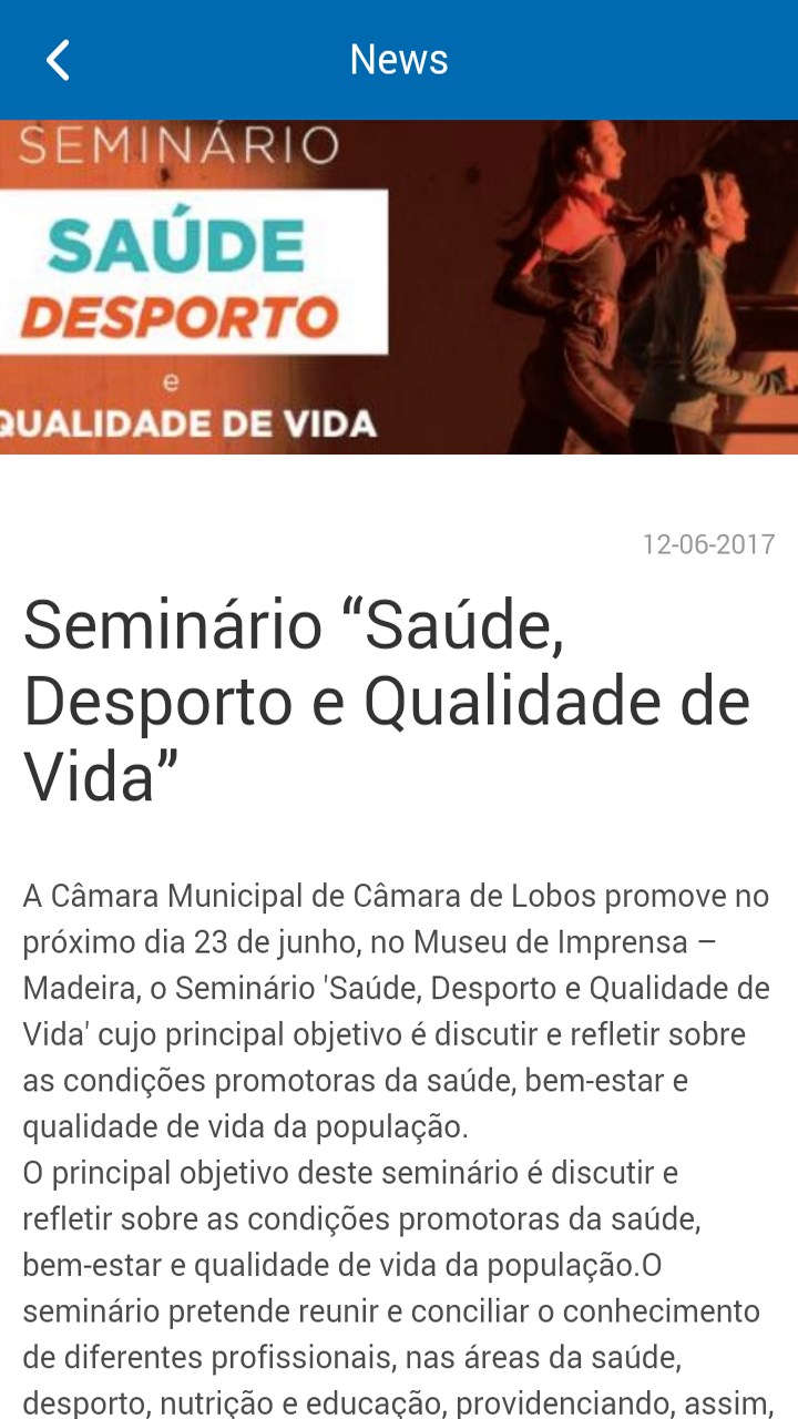 Application that aims to promote news and events, spread of information and tourist and cultural promotion of the municipality of Câmara de Lobos. The group of features will soon be available and the municipality will be able to communicate and receive direct feedback from the citizens, by providing some services.