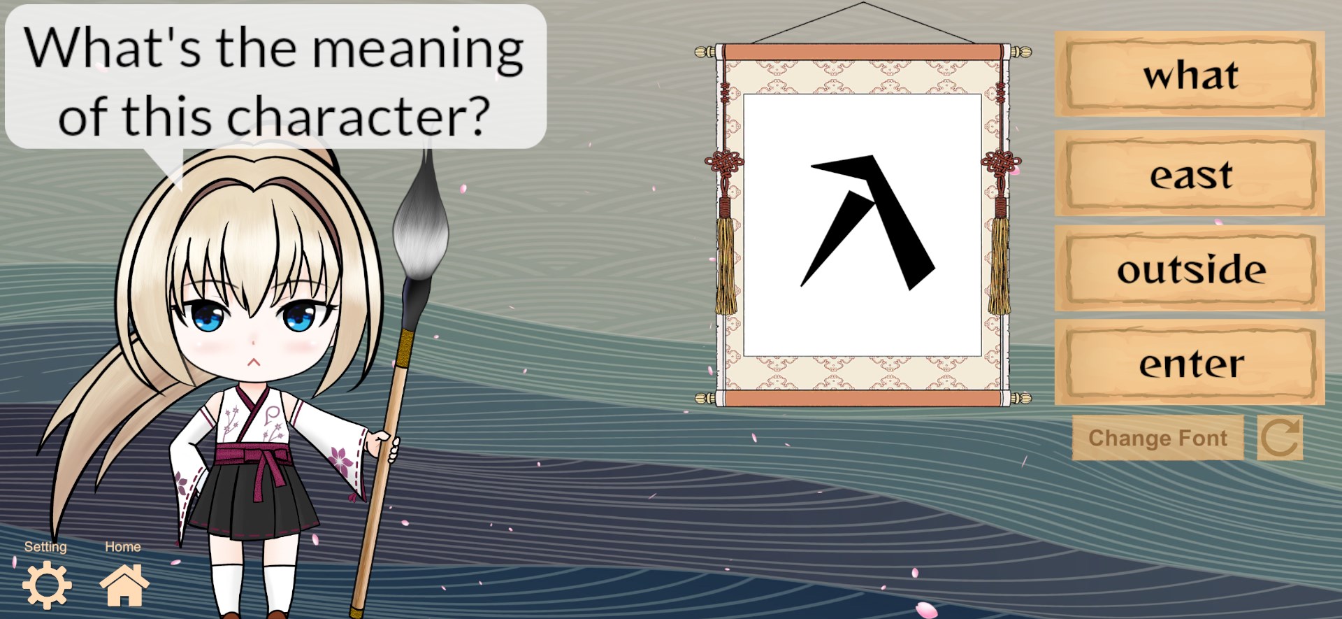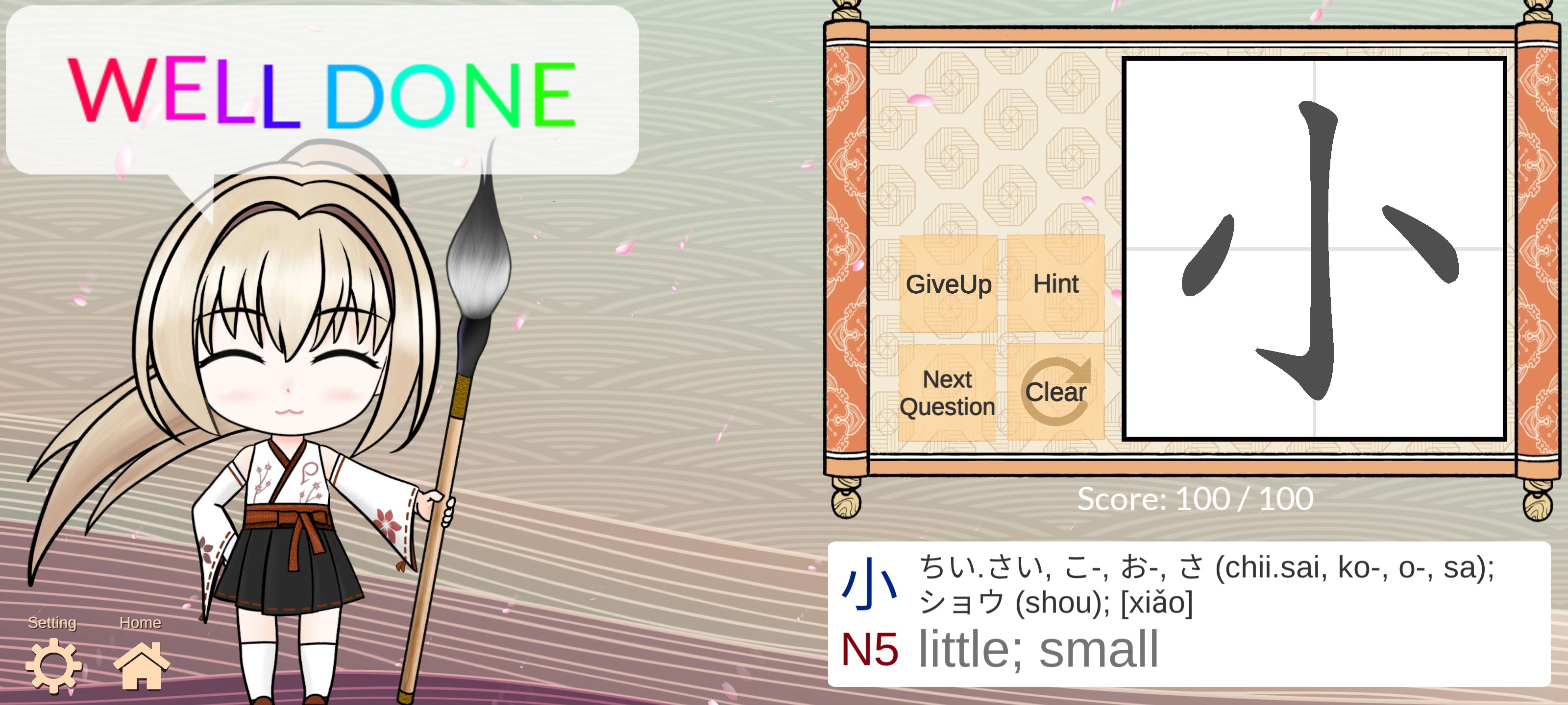 In each question, draw Kanji for given word(s). A score will be obtained if you can answer. Kotoba's emotion changes depending on on your performance.