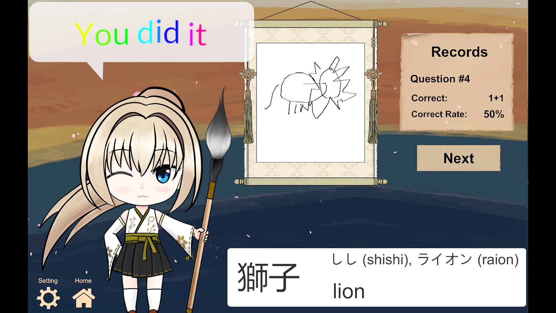 This app is designed to help learning languages (mainly Japanese, but also English and Chinese). Kotoba-chan, the AI, will teach you how to write Kanji characters and challenge you by quizzes. There is also a mode (under research) where you can learn Kanji from drawing objects.