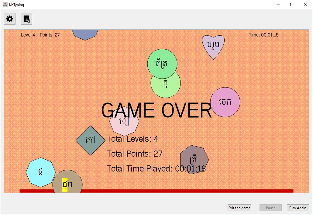 Additionally, KhTyping includes a fun mini-game called Falling Words Shapes, where players can challenge themselves by typing falling Khmer words to keep them from hitting the ground. It's a great way to practice typing under pressure while having fun!