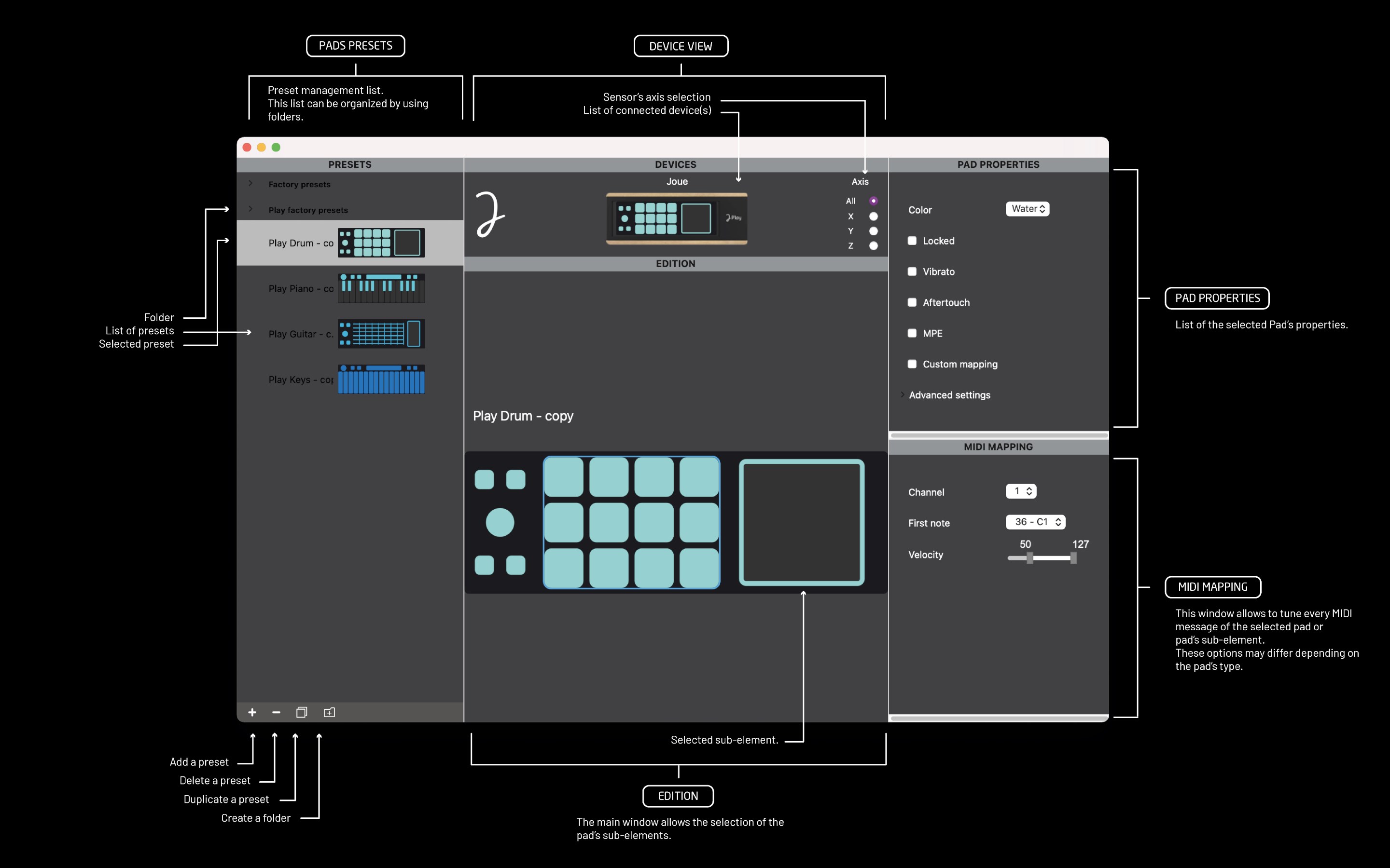 Upgrade your J-Play with the Pro Option and modify the sensitivity, velocity and the type of messages sent by the pads. Allow your J-Play to respond to natural gestures such as vibrato, bending and aftertouch : bring your virtual instruments to life !
