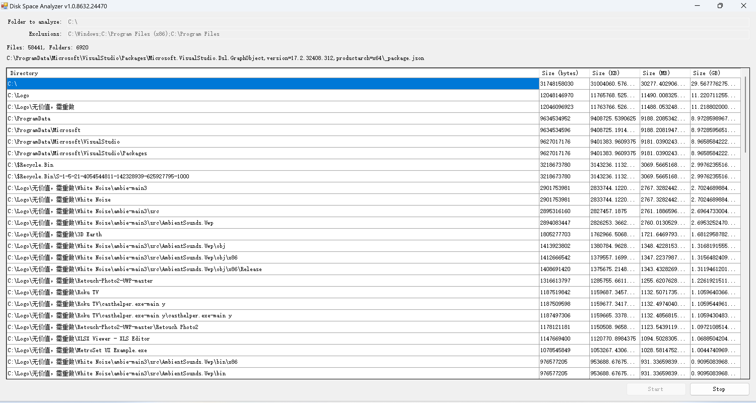 Disk Space Analyzer is a simple program that allows you to easily search directories, check information about them, check disk usage, find out which file types are taking up most of your space, and more.