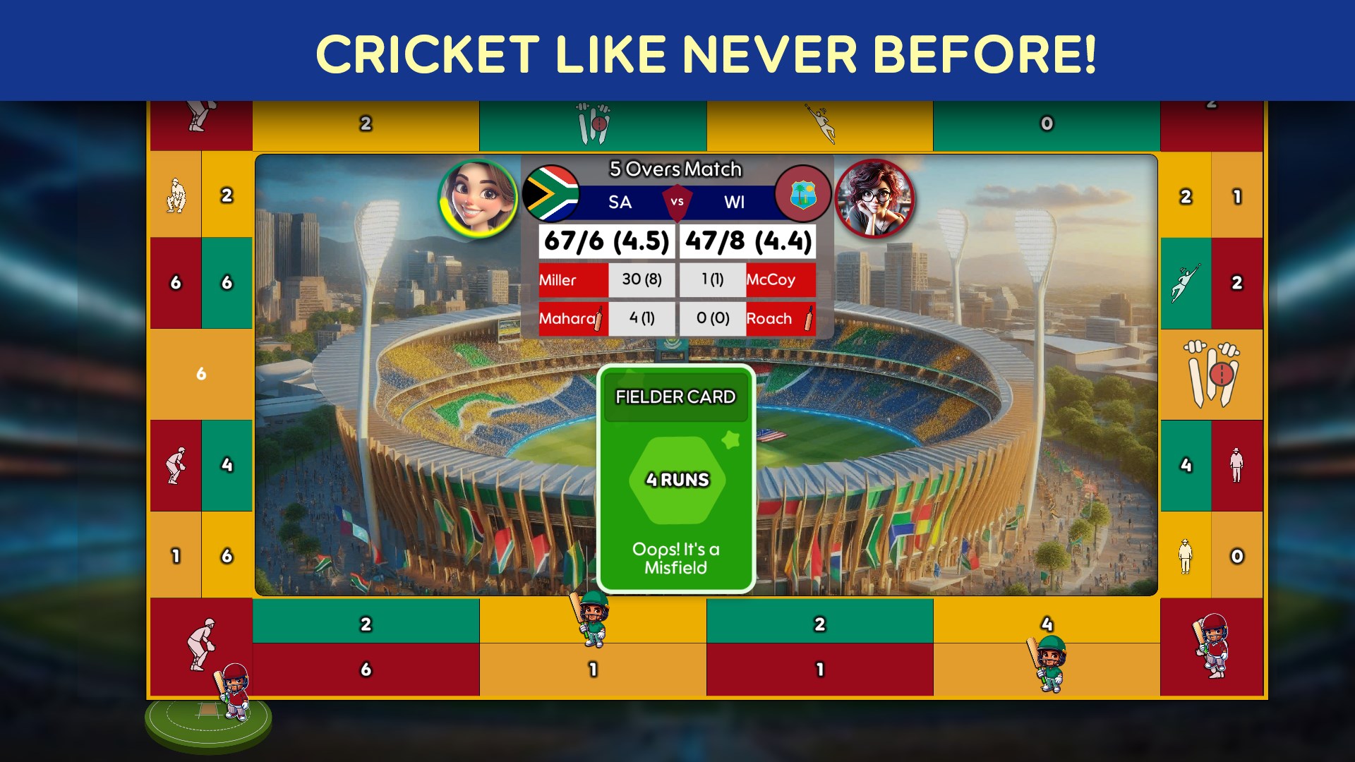 The Cricket Premier League includes special tiles such as No Balls, Wide Balls, and Appeals, which add unpredictability. Players may even encounter 3rd Umpire decisions, determined by dice rolls.