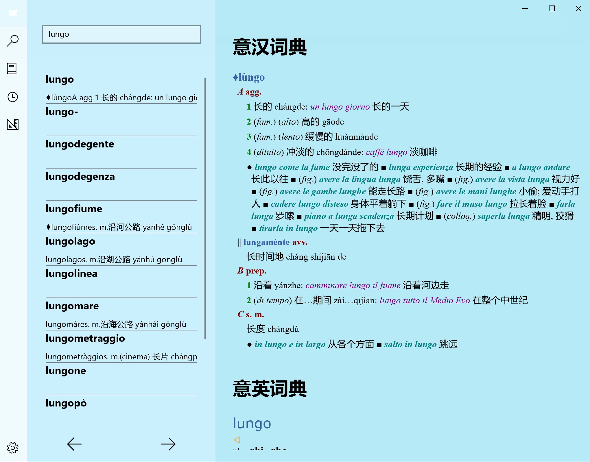 这是一款意大利语离线词典,包含意汉、意意、意英和动词变位词典。