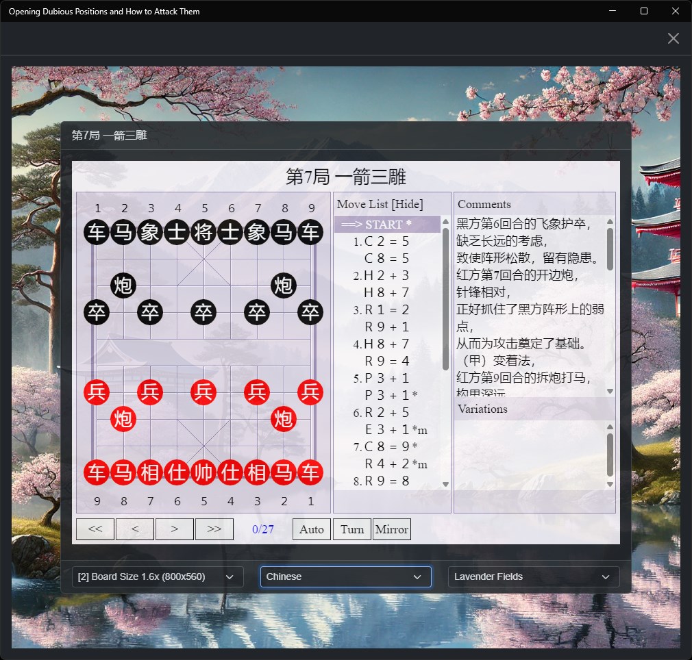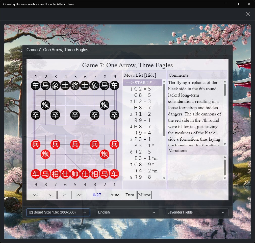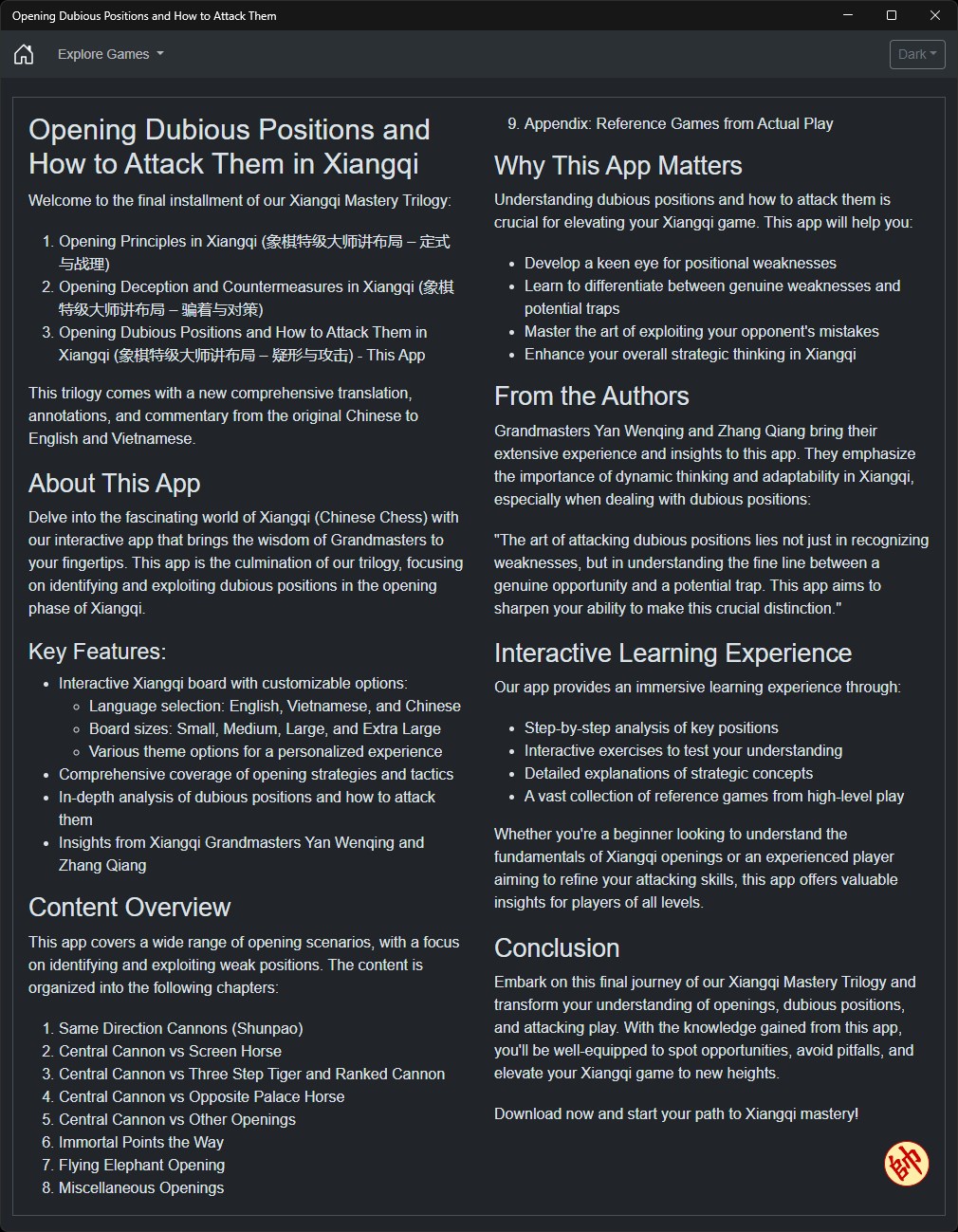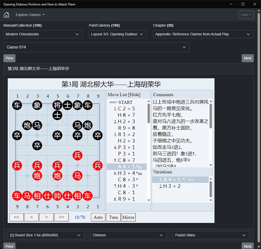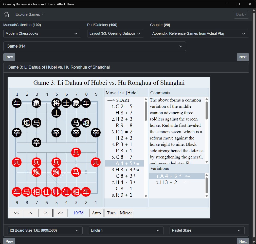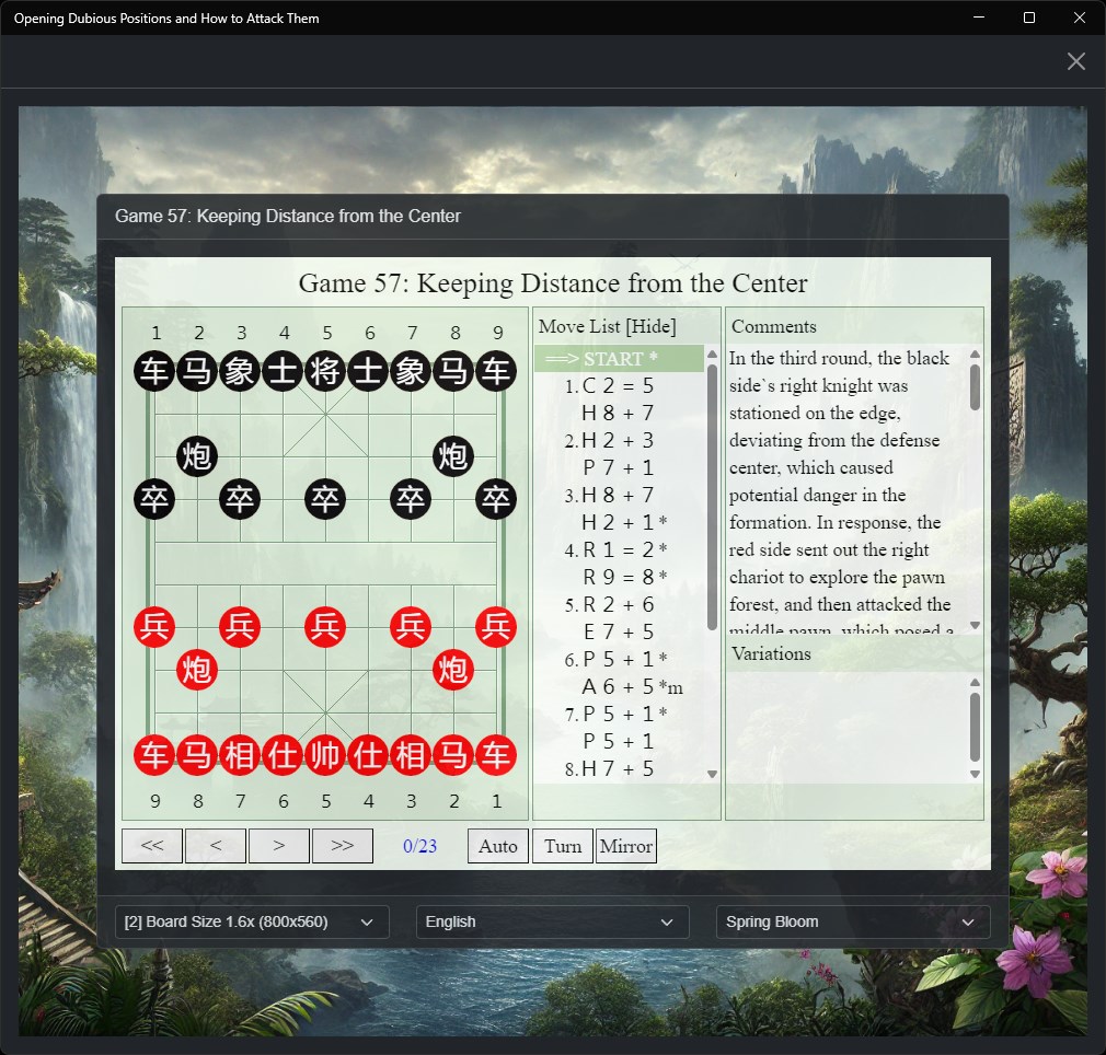Delve into the fascinating world of Xiangqi (Chinese Chess) with our interactive app that brings the wisdom of Grandmasters to your fingertips. This app is the culmination of our trilogy, focusing on identifying and exploiting dubious positions in the opening phase of Xiangqi.