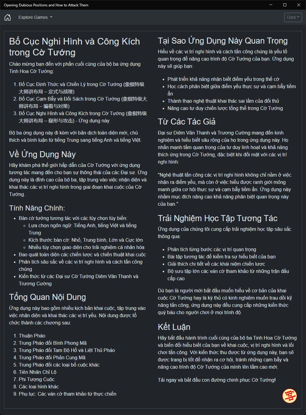 Embark on this final journey of our Xiangqi Mastery Trilogy and transform your understanding of openings, dubious positions, and attacking play. With the knowledge gained from this app, you'll be well-equipped to spot opportunities, avoid pitfalls, and elevate your Xiangqi game to new heights.