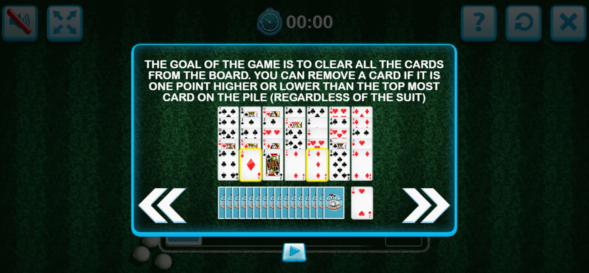 In Golf Solitaire, the bottom-most card in every pile is the only one exposed. Any exposed card can be placed on the Foundation during the game as long as it is either next to or prior in rank to the current top card in this section. This process goes on and on as the game carries on.