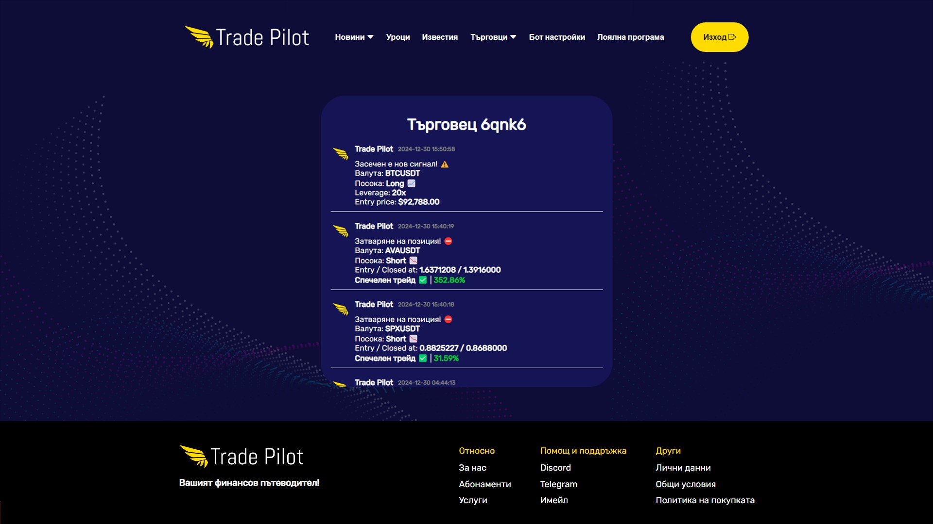 Trade Pilot Dashboard ви предоставя сигнали с невероятна успеваемост от над 92%, помагайки ви да направите информирани и успешни инвестиции. Всеки момент, който прекарвате с нас, е инвестиция във вашия финансов успех.