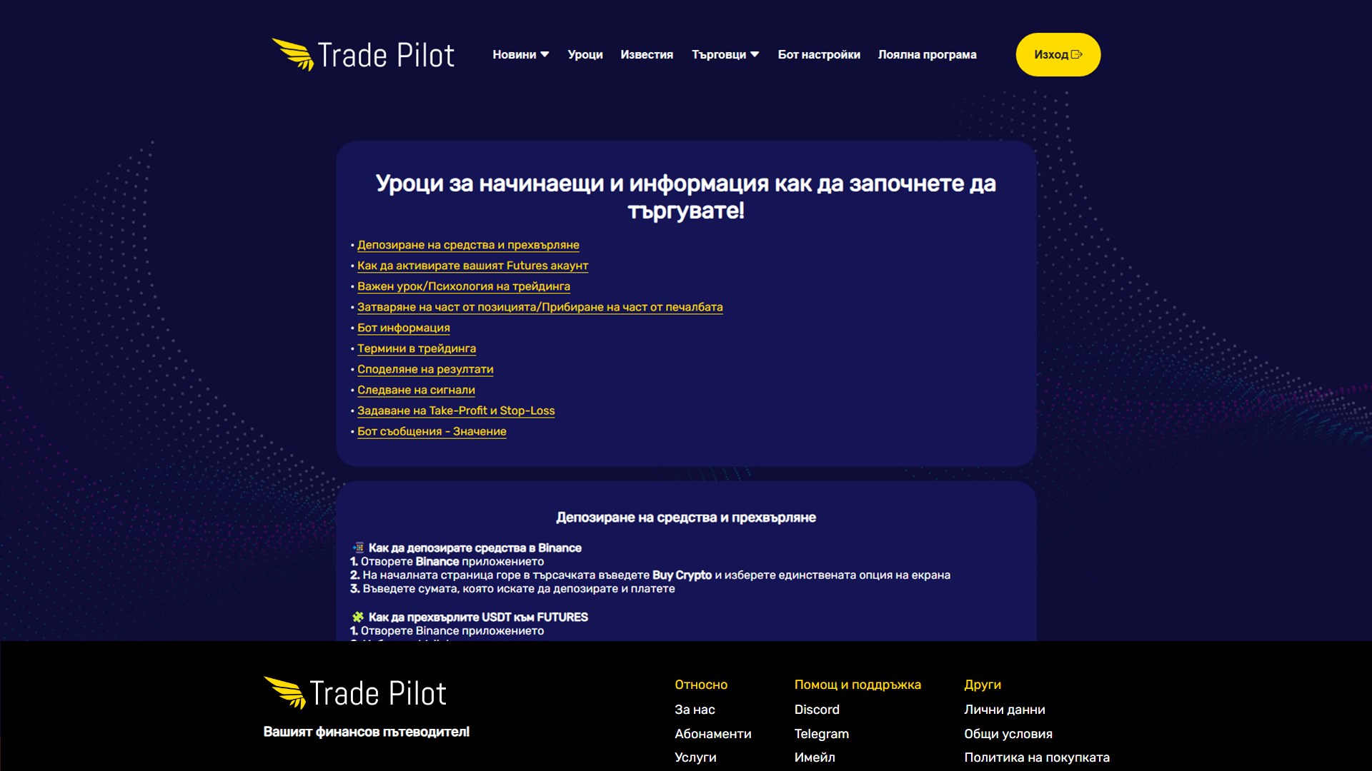 Открийте ценни уроци и подробна информация, необходима за усъвършенстване на вашия трейдинг. Независимо дали сте начинаещ или опитен търговец, Trade Pilot ви осигурява необходимите знания за успешни сделки.