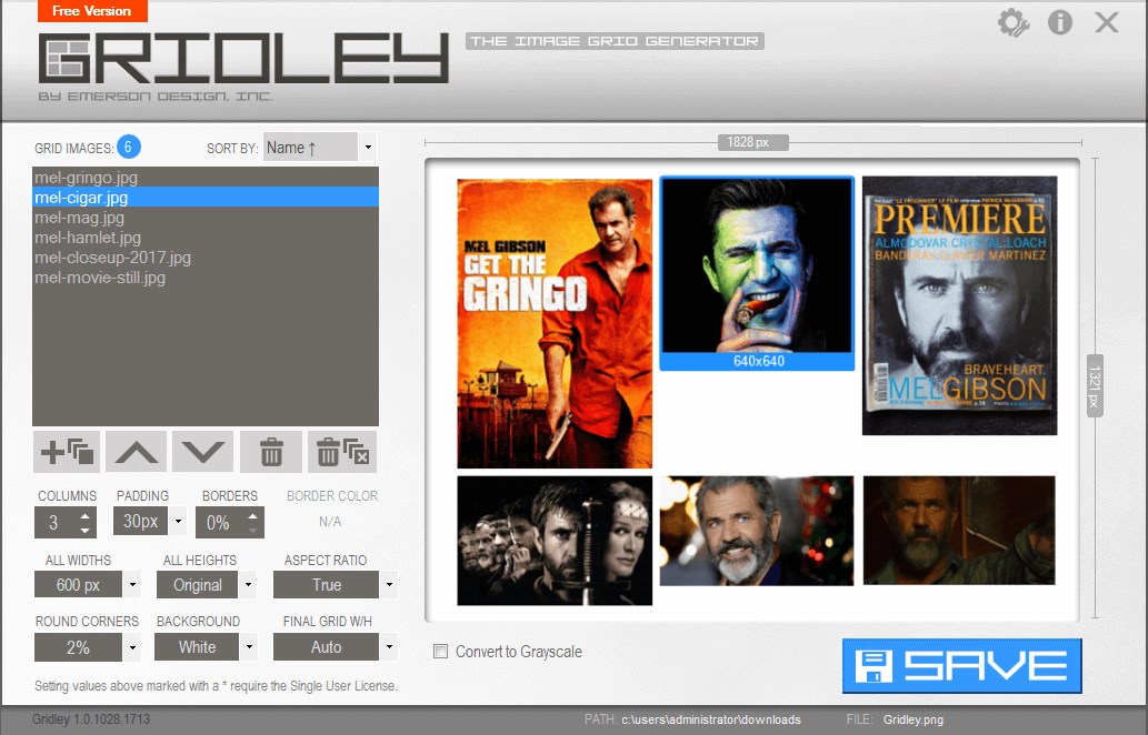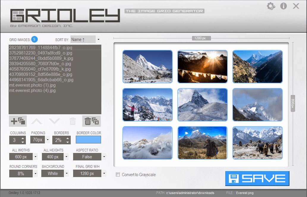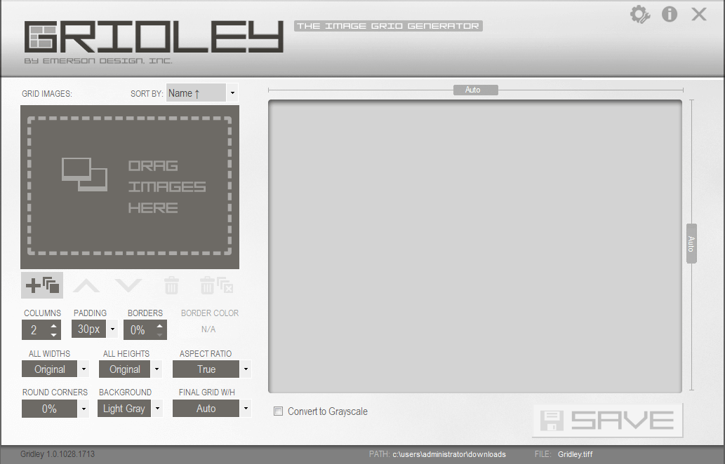 Gridley is a small but very powerful Windows application that converts multiple images into one 'grid' image or document in PNG, JPG, BMP, TIFF or PDF format.