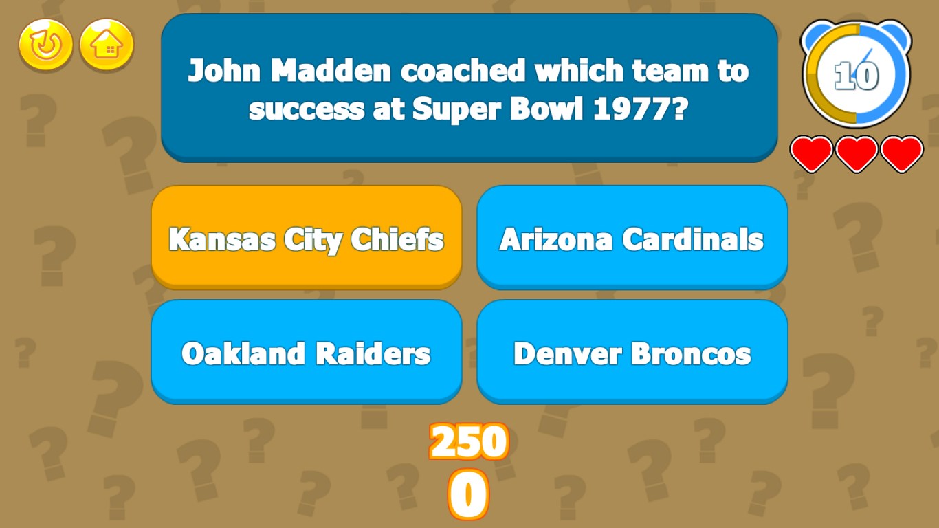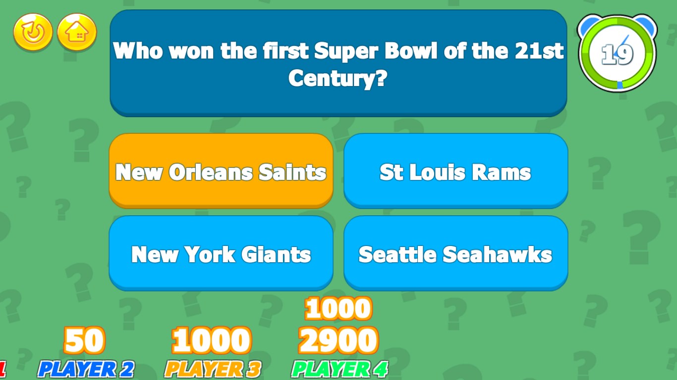 Super Bowl Trivia has never been so much fun. Challenge yourself or have a Super Bowl Trivia night with friends and family in Party Mode!