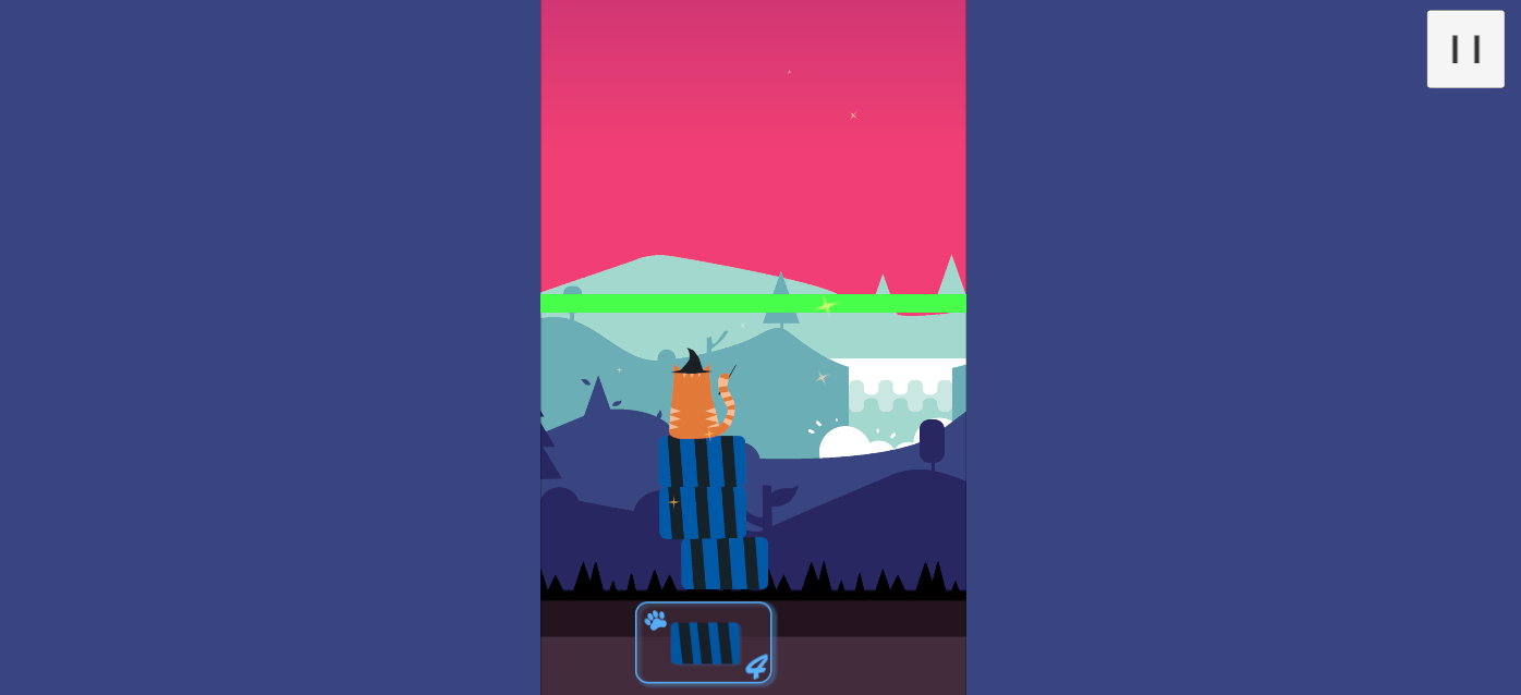 An orange cat is sitting on stacked rectangular blocks, seemingly on a mission to maintain balance or build height. In the background is a cartoon landscape with pink sky and mountains in the distance