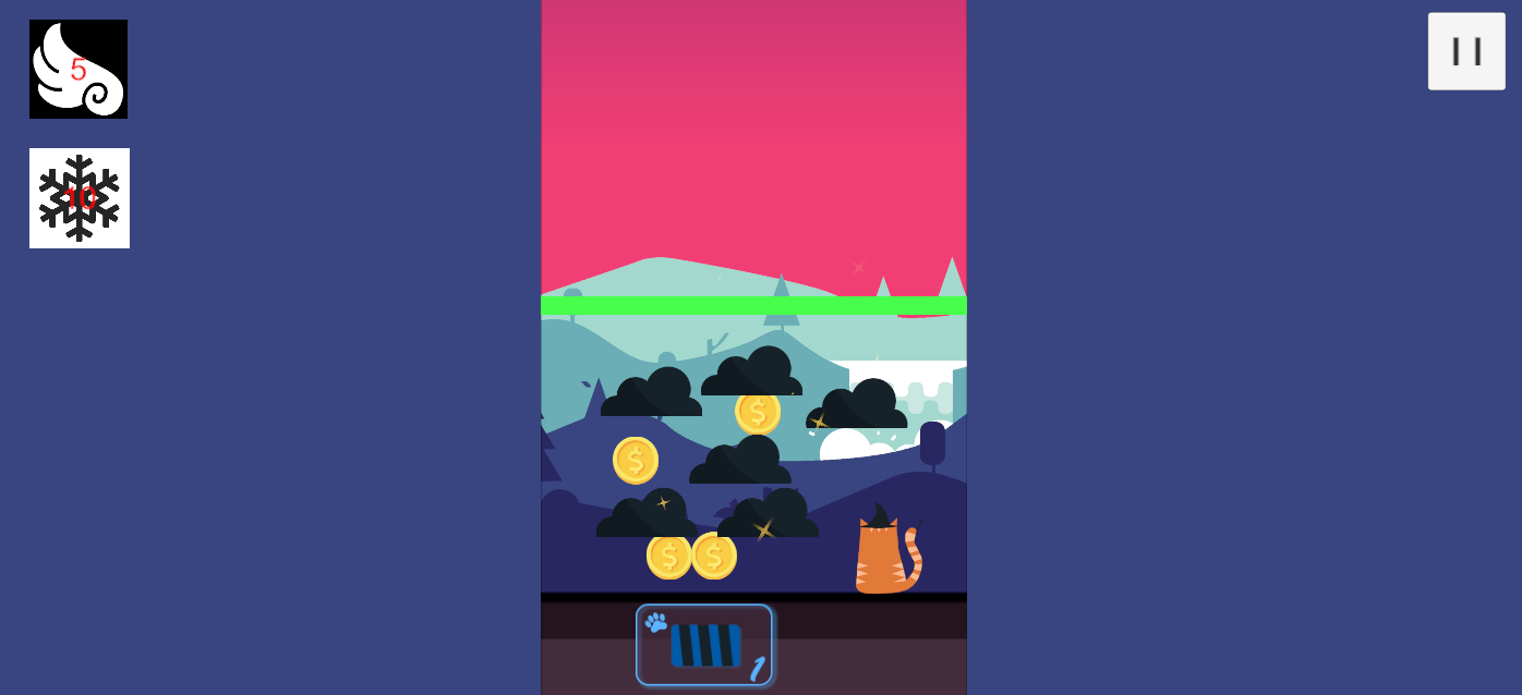 The orange cat has left its original position. The blocks have fallen, leaving behind black clouds and floating yellow coins. The interface showing the number of remaining blocks decreases. In the upper left corner there are special icons (like wings and snowflakes), which seem to be special items or skills in the game.