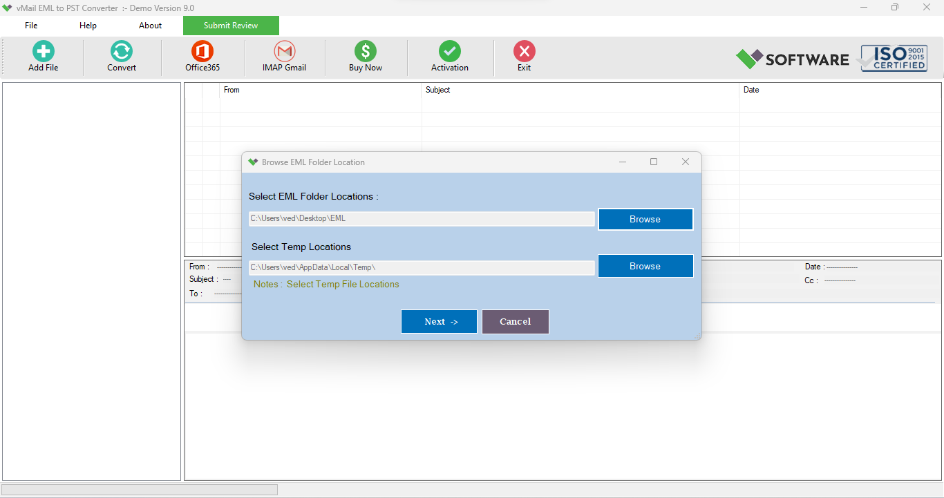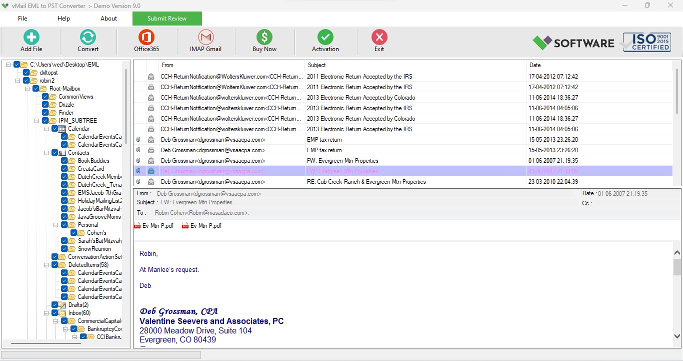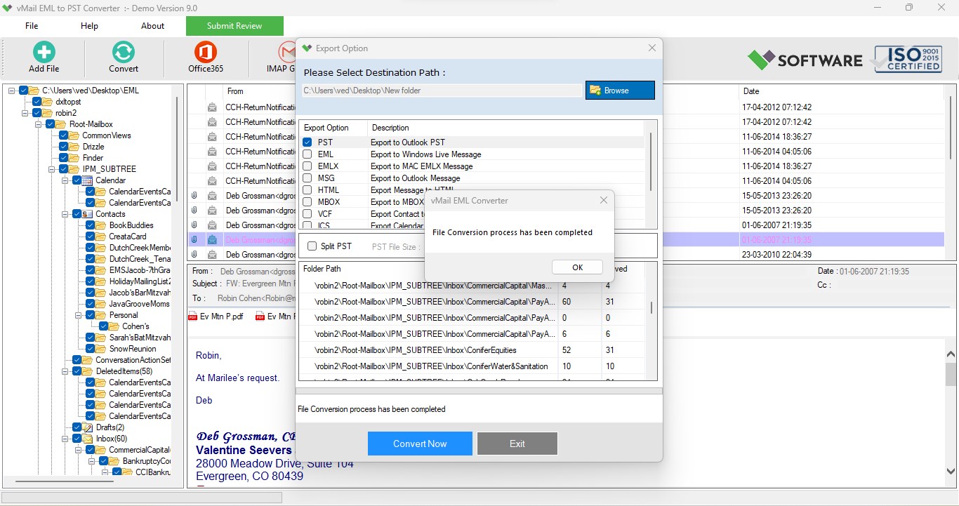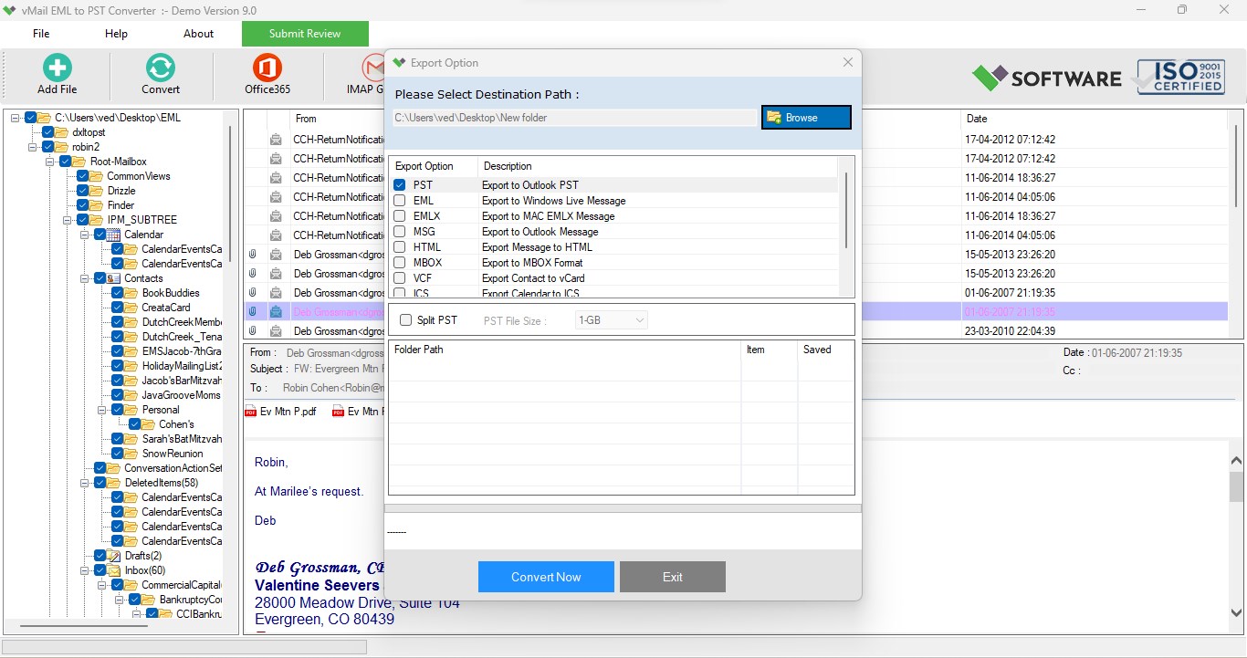 Limitation: Demo version enables you to preview the converted EML Files and save 30 EML Message items into Outlook PST File format, import Office 365 mailboxes account and others selected format.