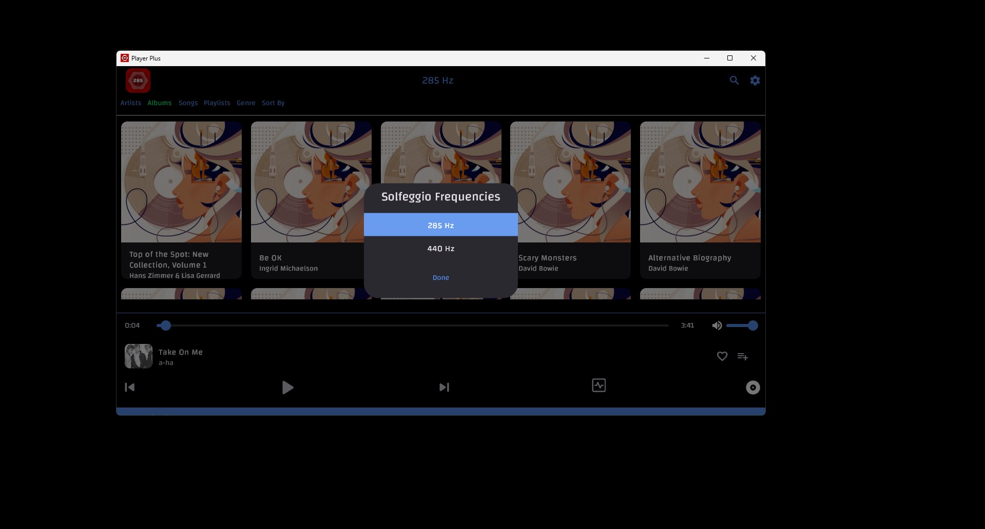 440 Hz to 285 HzRetune 440 Hz Music to 285 HzMusic player with shuffle, repeat one, repeat all modesMusic player with sleep timerMusic player with custom playlists