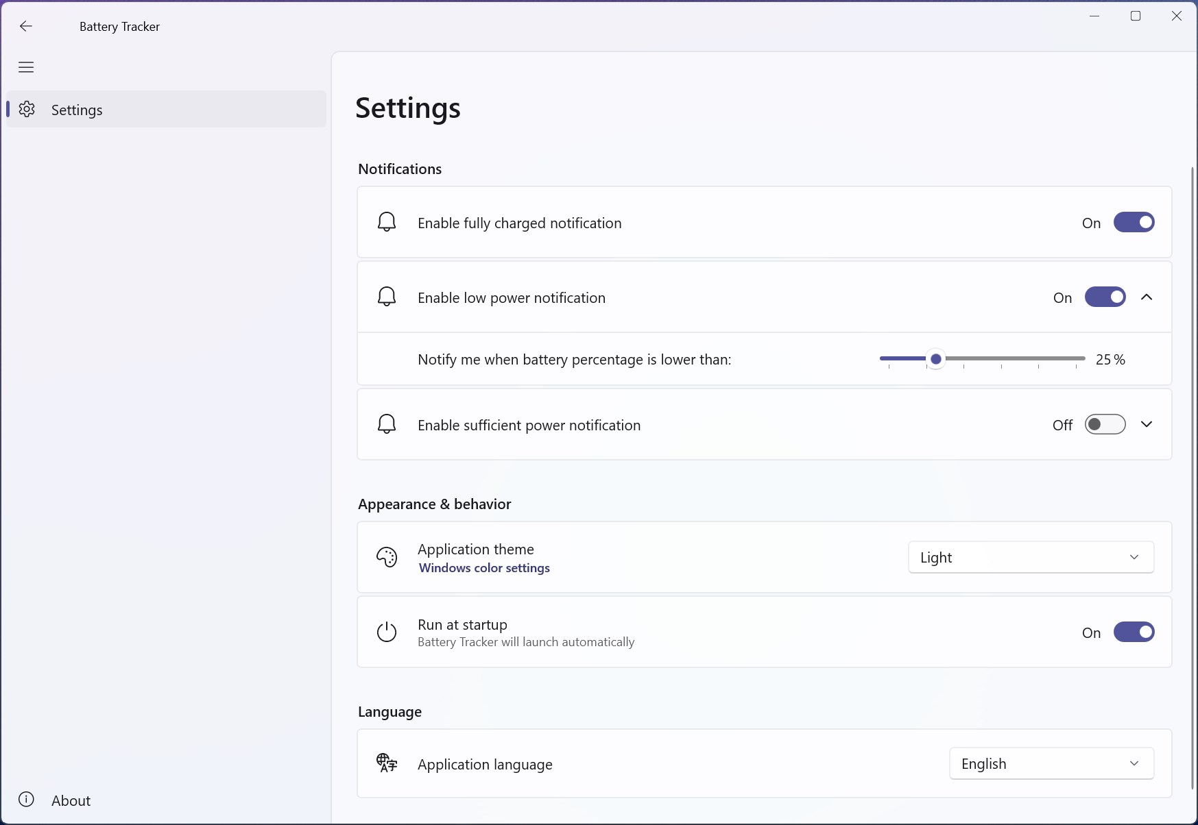 The program will show the remaining battery percentage on the taskbar. It will automatically switch the icon color when users change to Light/Dark mode. Moreover, it will notify you when the battery percentage is less/greater than a customizable threshold or the battery is fully charged.
